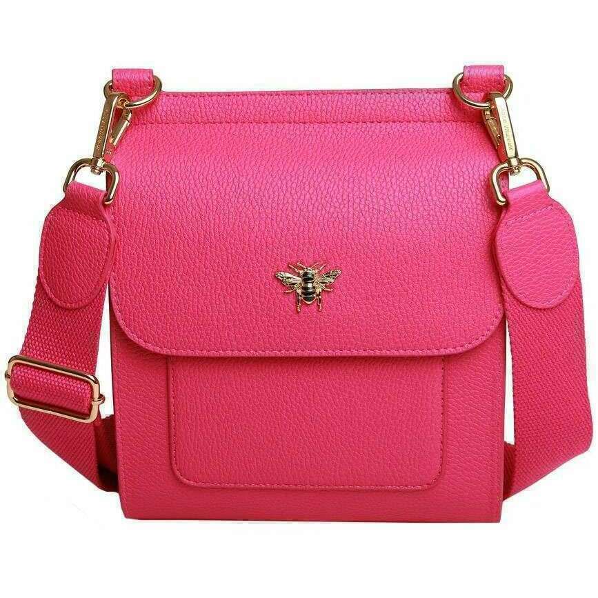 This women's bloomsbury crossbody bag by the brand Alice Wheeler London is made from 100% vegan faux leather and is showcased in pink. It measures 18cm(height) x 20cm(width) x 12cm(depth). All the bags come complete in alice wheeler london packaging. The Alice Wheeler London Bloomsbury Crossbody Bag - Hot Pink will make a stunning and stylish everyday bag or will accessorise your evening outfit when at a more formal event. Fitted with an adjustable cross body strap you can find a length that best suits you for comfortable carrying. The Bloomsbury offers a good-sized main section and is secured with a flap and magnetic clasp closure. The iconic and elegant Bumble Bee logo rounds off this gorgeous design as well as named branding on the back.