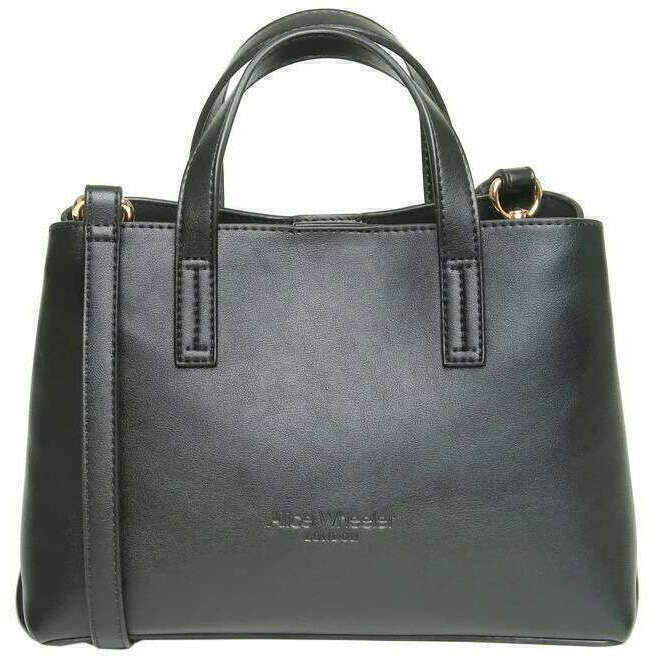 Perfect for women is this Alice Wheeler London black florence handbag, it is also made from 100% nappa finish vegan faux leather. It measures 17cm(height) x 26cm(width) x 12cm(depth). All the bags come complete with alice wheeler packaging. The Alice Wheeler London Florence Handbag - Black will make a lovely chic accessory that will be perfect for any occasion. Its elegant smooth sleek design allows you to pair this bag with any outfit making this perfect for everyday. Inside is a double compartment with an integrated zipped section ensuring you have a space for your valuables as well as compartments with easy access for grab and go belongings like sunglasses or lipstick. The double carry handles and choice of the adjustable crossbody strap ensures easy carrying making it a must have piece.