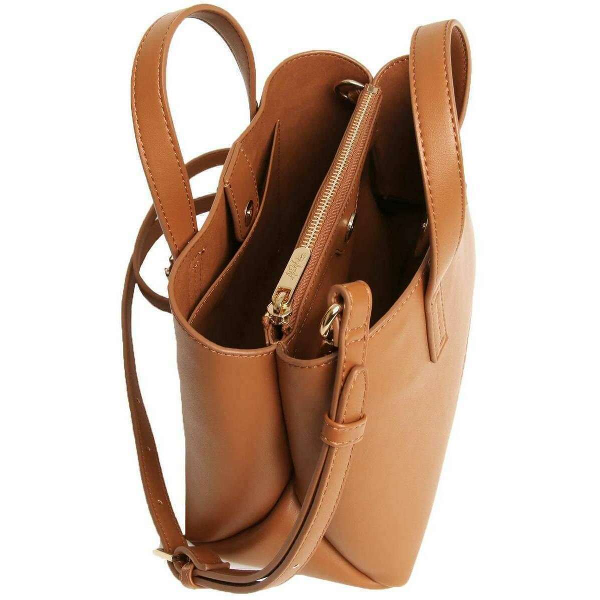 • 2 Carry Handles , Adjustable Crossbody Strap , 2 Large Compartments , Third Middle Zippered Section , Magnetic Closure , Gold Metal Hardware
