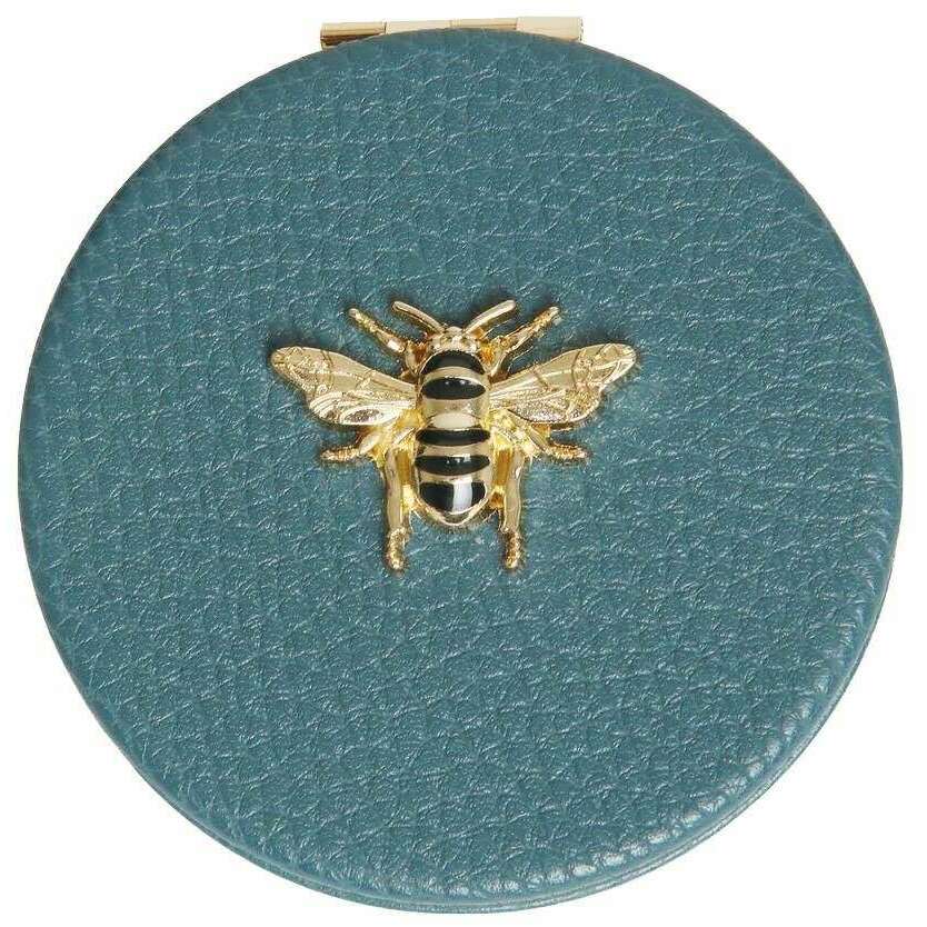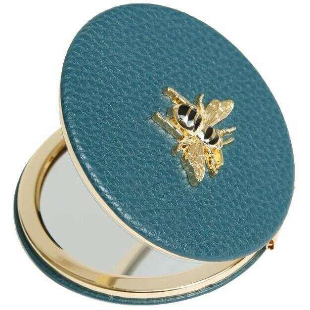 Introducing this women's round compact mirror by Alice Wheeler London, it is manufactured from 100% vegan faux leather in a teal blue colour. It measures 7cm(height) x 7cm(width). All the compacts come complete in alice wheeler london packaging. The Alice Wheeler London Round Compact Mirror - Teal Blue is the perfect accessory that is essential to carry around with you in your handbag. The beautifully iconic bee embellishment adorns the front of it. Inside is a 7x magnifying mirror with a twin gold-toned metal frame which is ideal for those day to day touch ups.