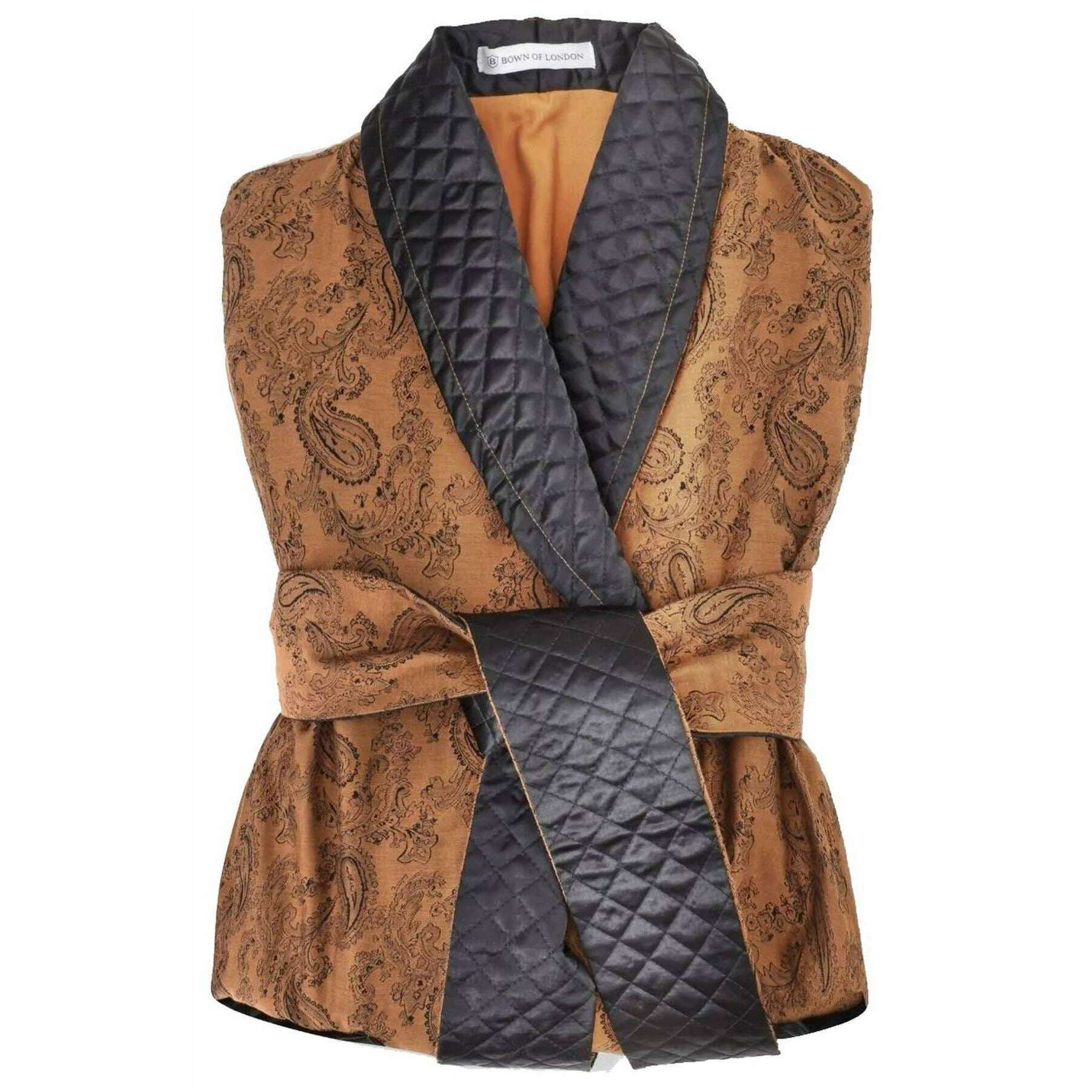 This men's midas lux cotton short smoking jacket by the brand Bown of London is made from 100% premium cotton and is showcased in gold. Also the gold/black dressing gown is designed in a paisley pattern, It is recommended to dry clean only to keep this dressing gown in good condition. All the dressing gowns come complete with bown of london dust bag. The Bown of London Midas Lux Cotton Short Smoking Jacket - Gold/Black has a shorter length and is beautifully crafted from the softest fabric yet with a small amount of stretch to provide you with the perfect fit. The quilted satin collar and cuffs contrast elegantly so you re sure to lounge in style. Featuring two front pockets and an adjustable belt, comfort and practicality is paramount. Ideal for using as a smoking jacket, this robe is perfect for any gentleman.