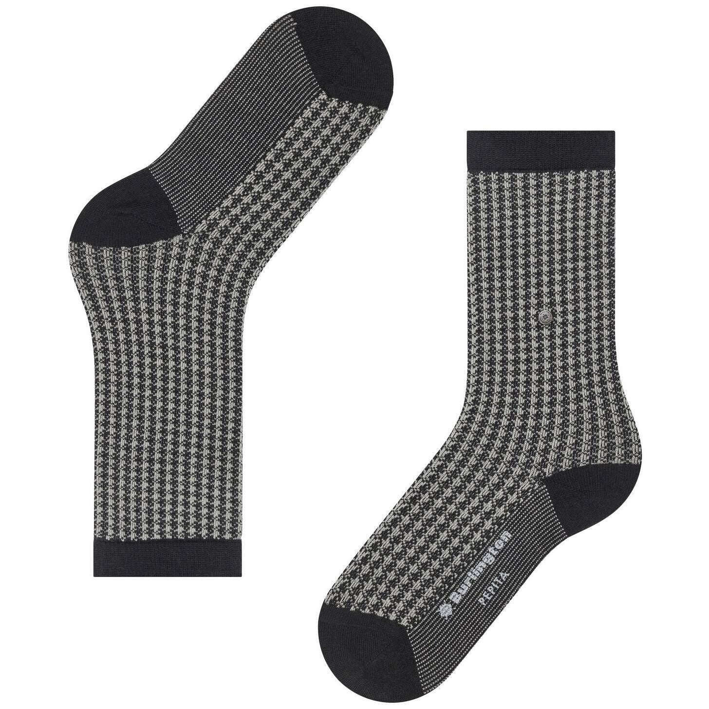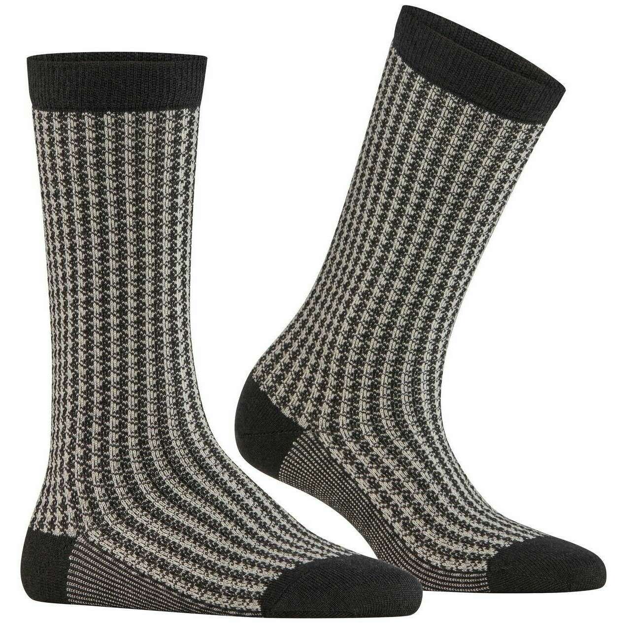 These pepita socks for women are fashioned by the brand Burlington in a black colour and are made from 73% virgin wool, 25% polyamide (8% recycled) and 2% elastane. Also the black socks are designed in a houndstooth pattern, It is recommended to wash at 30 degrees to keep these socks in good condition. All the socks come complete with burlington socks tags. The Burlington Pepita Socks - Black are a stylish, unique addition to any wardrobe, designed to add a touch of flair while ensuring comfort and durability. These socks combine the delicate houndstooth design with the iconic Burlington clip on the side to enhance any outfit. The warming wool blend keeps these socks breathable, while the stretch fabric ensures they fit comfortably without slipping.