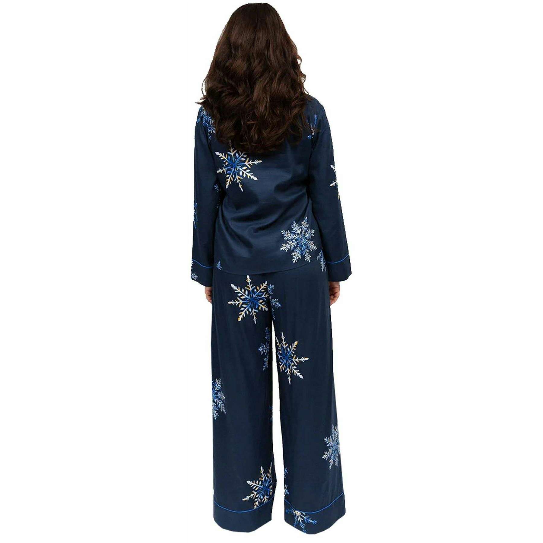 These women's frosty snowflake pyjama set by the brand Cyberjammies are made from 60% cotton and 40% modal and are showcased in navy. Also the navy pyjamas are designed in a unique pattern, It is recommended to machine wash inside out, do not soak, wash with like colours to keep these pyjamas in good condition. All the pyjamas come complete with cyberjammies tags. The Cyberjammies Frosty Snowflake Pyjama Set - Navy is perfect for embracing winter comfort. Made from a soft cotton-modal blend, this set features a delicate snowflake print on a deep navy background for a cosy, seasonal look. The top includes a revere collar, shaped hem, and blue modal-covered buttons, while the wide-leg bottoms offer an elasticated back, flat front, adjustable drawstring, and side pockets for ease. Finished with subtle modal piping, this set is perfect for slow mornings, long nights, and festive lounging.
