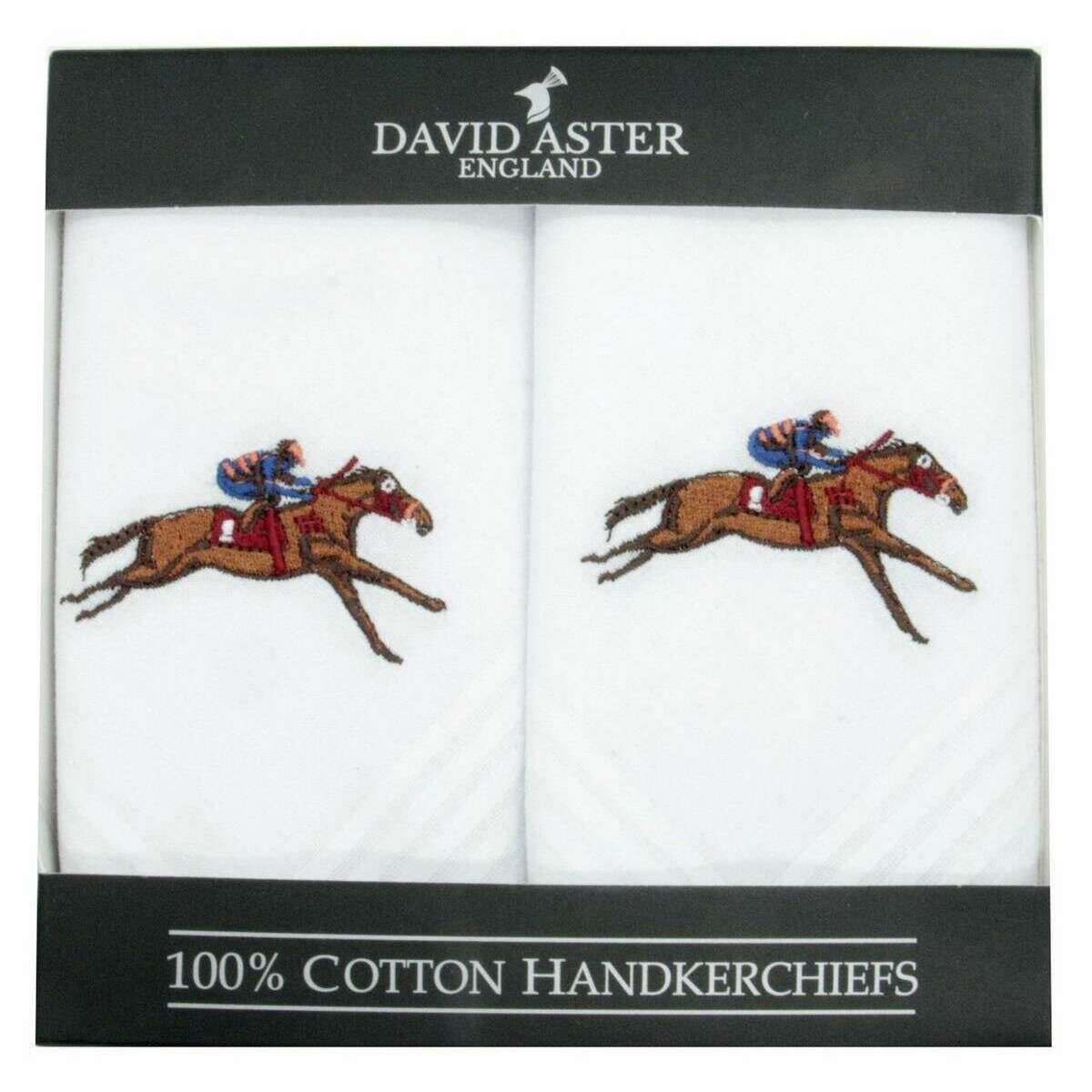 Perfect for men is this David Aster white racehorse embroidered handkerchiefs, it is also made from 100% cotton . 2 pack handkerchiefs are value for money ensuring they are a good buy, All the handkerchiefs come complete with a david aster presentation box. The David Aster Racehorse Embroidered Handkerchiefs - White is a stunning pack to own with it featuring a race horse on each with a white background. Certain to impress, this will be guaranteed to give your attire the perfect finishing trendy look due to its personalised design making you stand out from the crowd. Make this a great gift to any races fanatic.