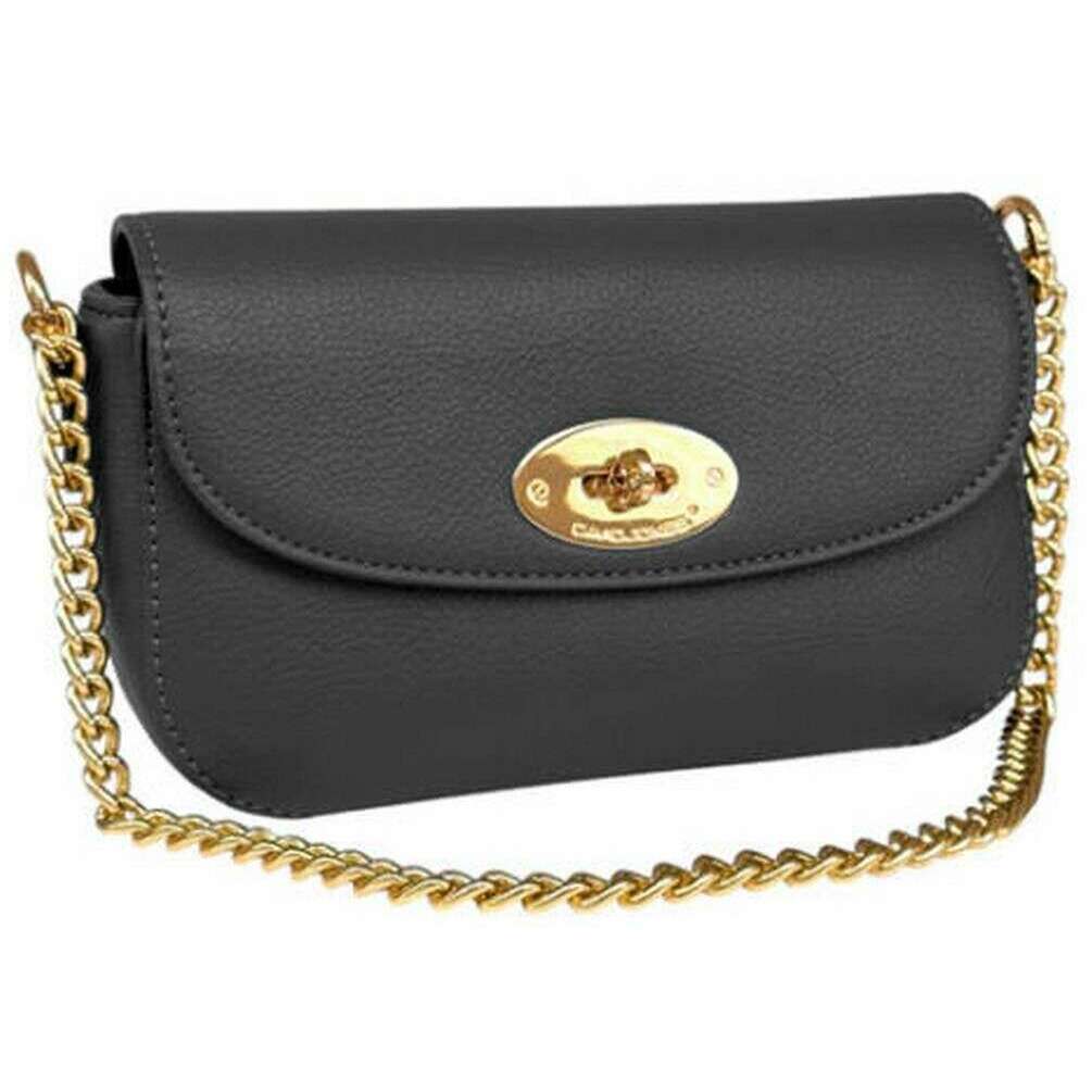 This occasion half flap shoulder bag for women is fashioned by the brand David Jones in a black colour and is made from 100% polyurethane. It measures 13cm(height) x 20cm(width) x 6cm(depth). All the bags come complete with david jones packaging. The David Jones Occasion Half Flap Shoulder Bag - Black is the perfect choice for occasions where you want to add a sophisticated and girly touch. The gold chain strap gives an expensive appeal perfect for dressing up any outfit, formal events or just for drinks with the girls, whilst the flap over design is kept in place by a typical metal turn lock giving the bag a unique, standout look. Featuring a zipper and open internal pocket ensures organisation for easy accessibility to your smaller precious belongings. Even though this bag may look small it is deceiving as this bag holds all your essentials you need when on the go.