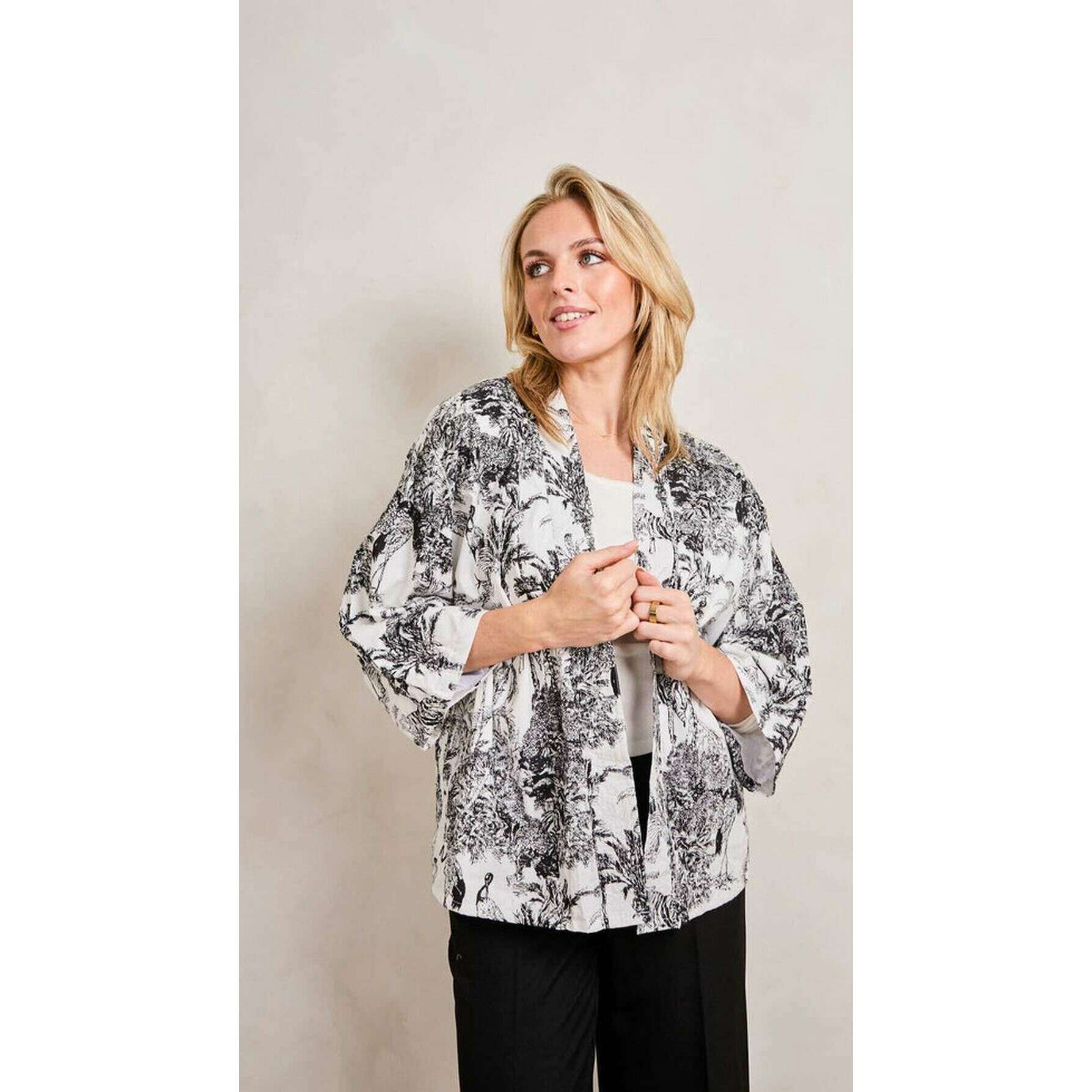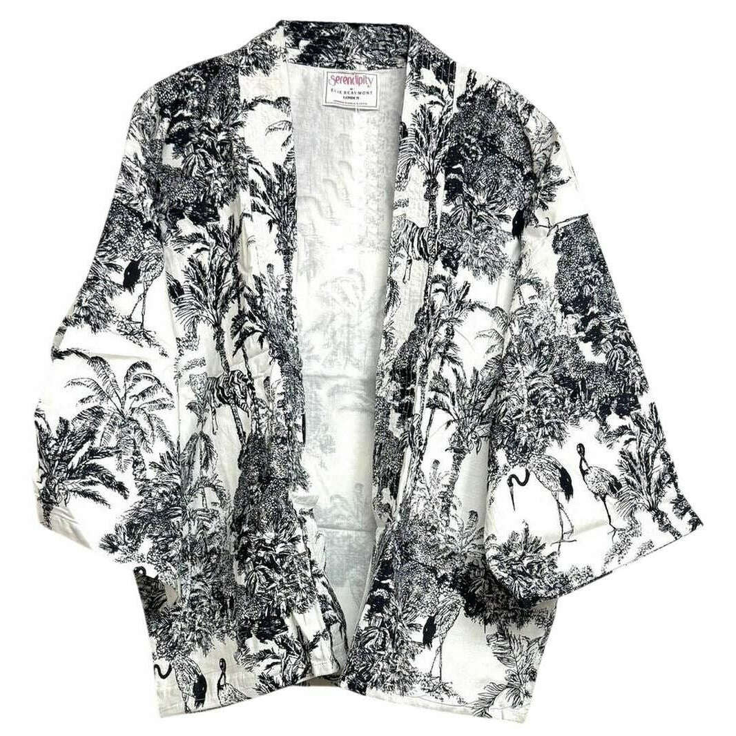 Manufactured from 100% natural cotton is this black/white crane women's serendipity short kimono by the designer Elie Beaumont. All the jackets come complete with elie beaumont packaging. The Elie Beaumont Serendipity Short Kimono - Black/White Crane will provide you with a real standout look that you are sure to love! The bold colours and the intricate design makes this kimono jacket really standout. This kimono is fully lined, breathable and has length sleeves.