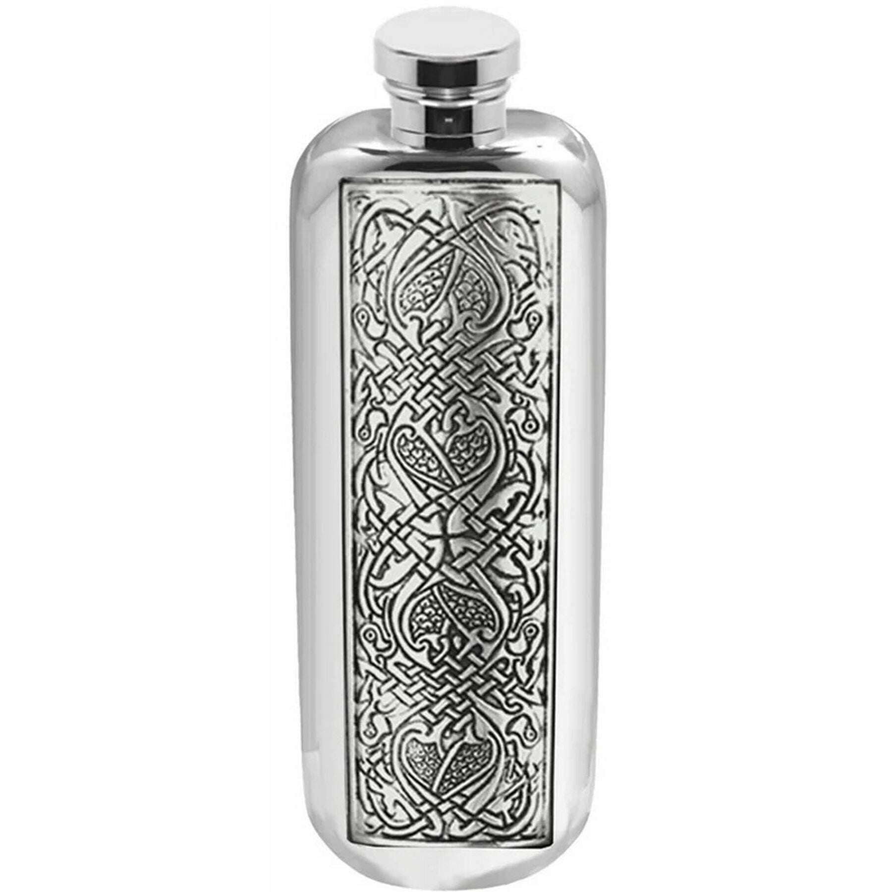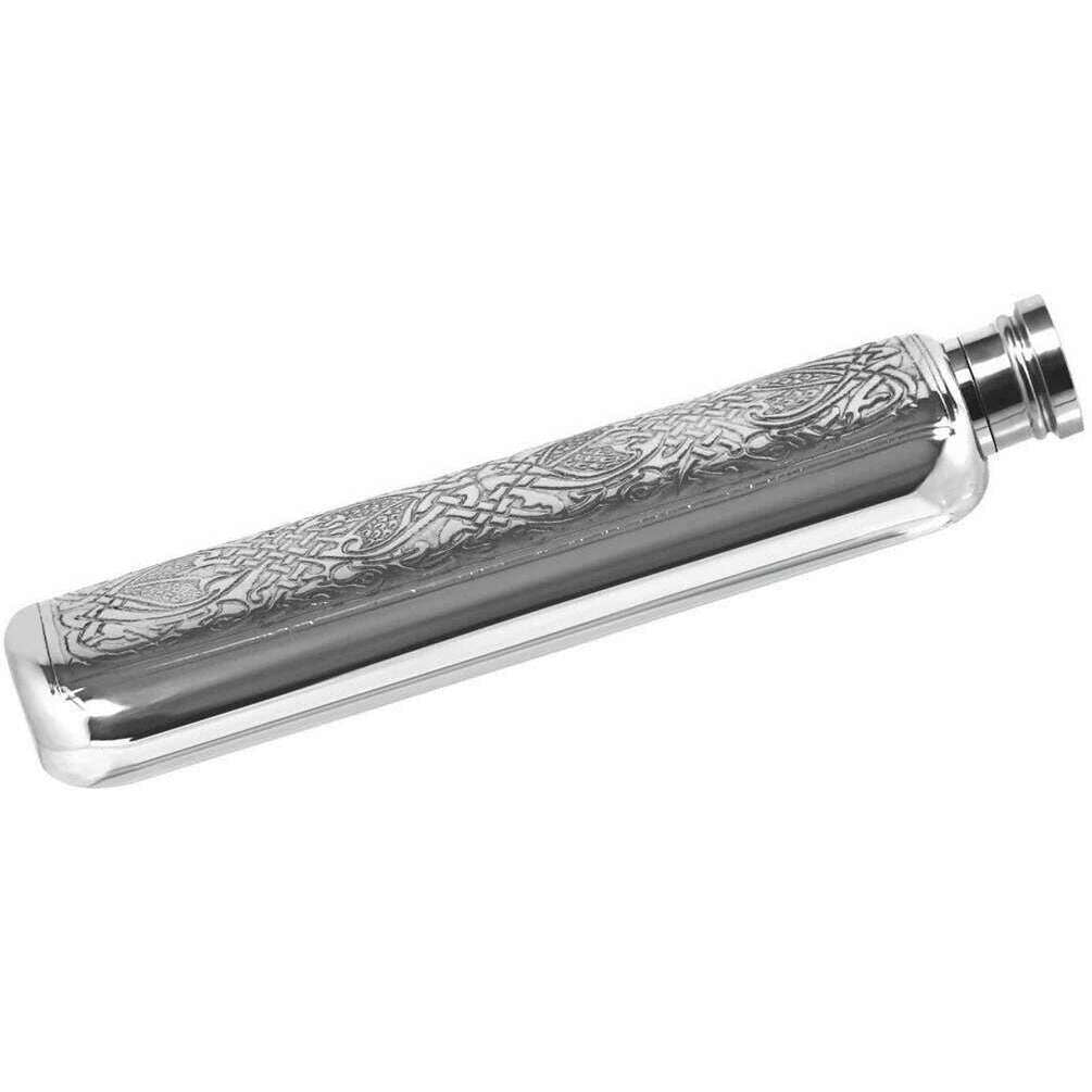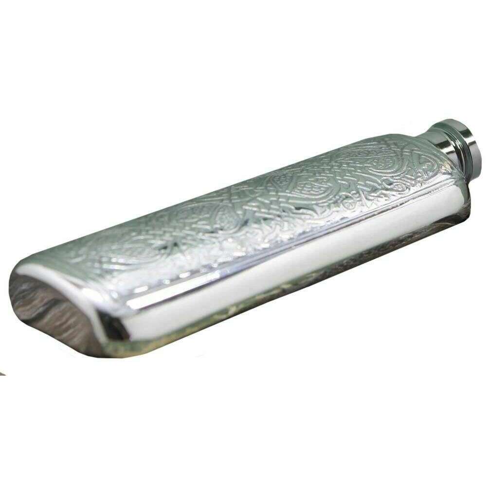 Designer English Pewter Company has brought you this unisex pewter hip flask using silver tones. It measures 15cm(height). All the hip flasks come complete in a english pewter company gift box. The English Pewter Company 3oz Celtic Top Pocket Flask - Silver features a gorgeous Celtic design ensuring a sleek and stylish companion. Blending both elegance and practicality, this purse hip flask is the epitome of sophistication. The screw-cap ensures that your favourite beverage is secure inside with its leak-proof seal but also making sure it is easily accessible. Its timeless design and durable construction make it a wonderful gift for friends, family, or even yourself.