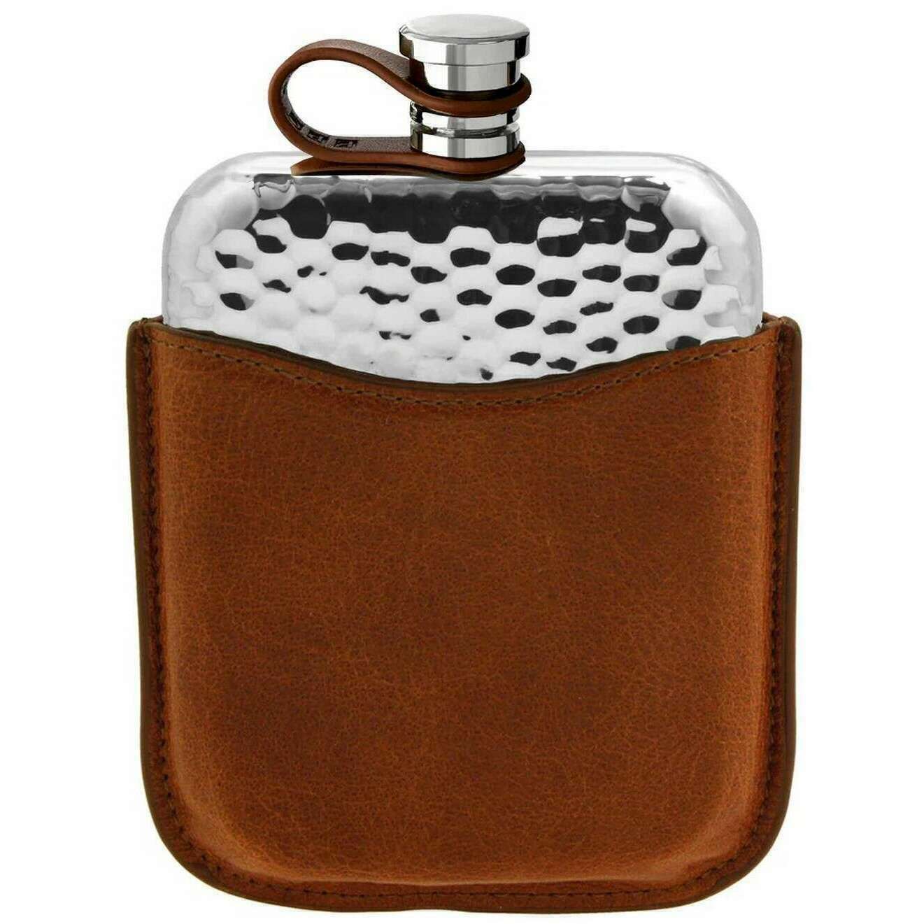 English Pewter Company 6oz Leather Pouch Flexi Cap Hammered Purse Flask - Silver