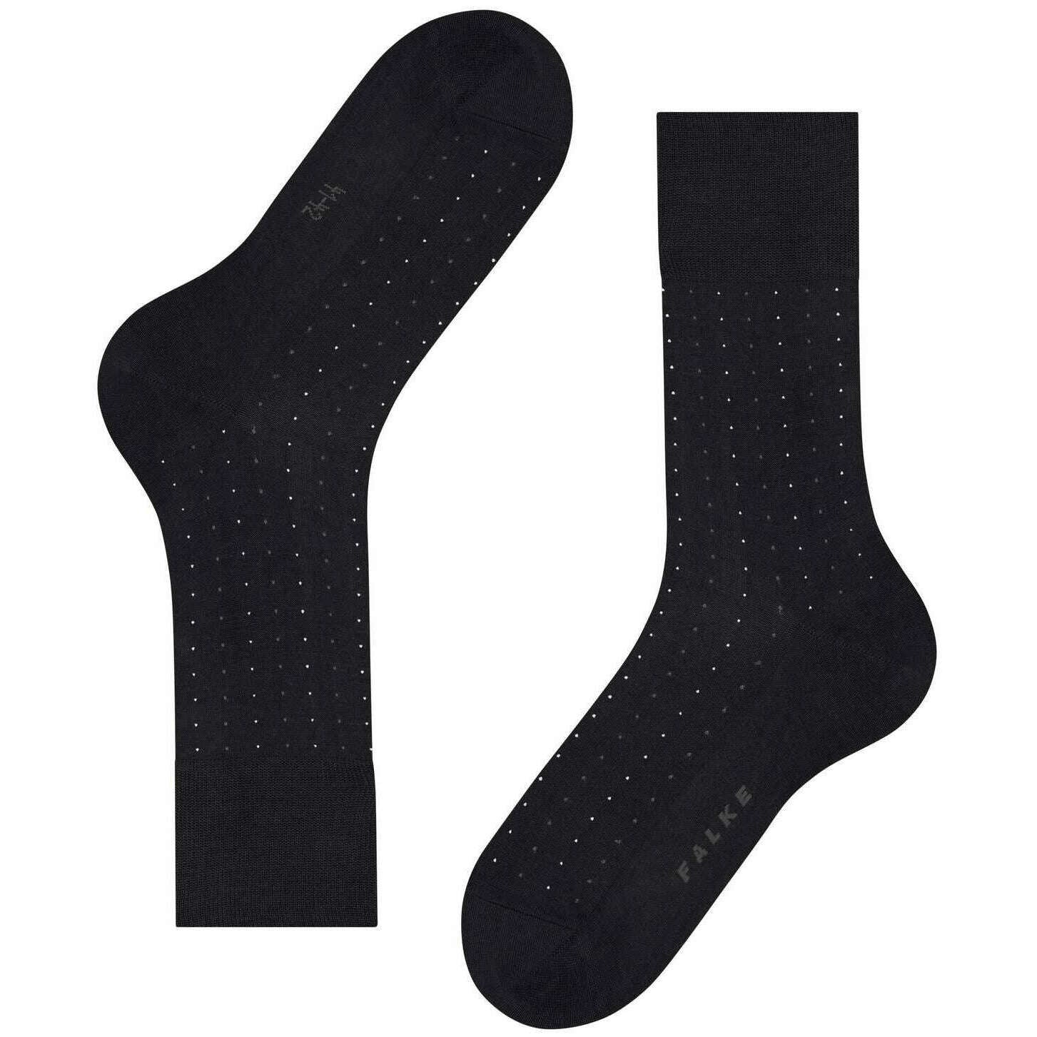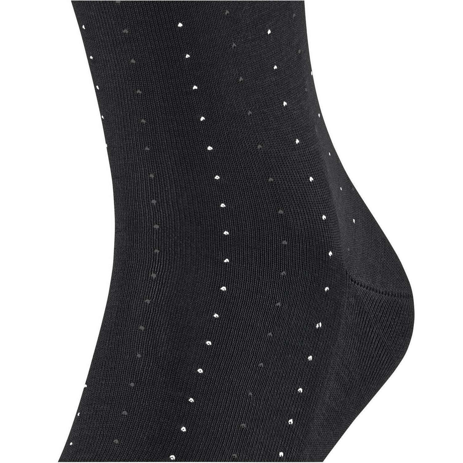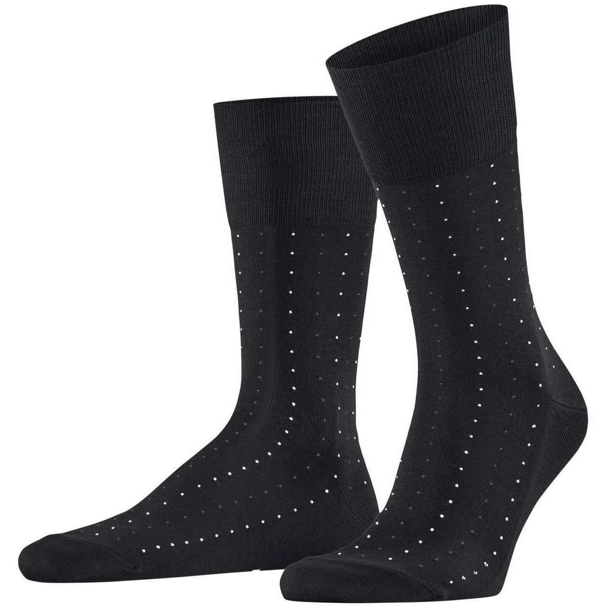 These men's tiago dotted line socks by the brand Falke are made from 93% cotton, 5% polyamide and 2% elastane and are showcased in black. Also the black socks are designed in a pin dot pattern, It is recommended to wash at 30 degrees to keep these socks in good condition. All the socks come complete with falke tags. The Falke Tiago Dotted Line Socks - Black are ideal for active men! Business or leisure these socks offer a two-tone dot design for a stylish look. Lightweight thanks to the high-quality Fil d' cosse cotton, you feel comfortable all day. The extended cuff ensures a wrinkle-free fit on the leg, while reinforced stress zones guarantee high durability. The unique colour brilliance and iconic appearance allow you to combine these socks with any outfit. With the Falke Perfect Fit, these socks make an excellent gift idea.