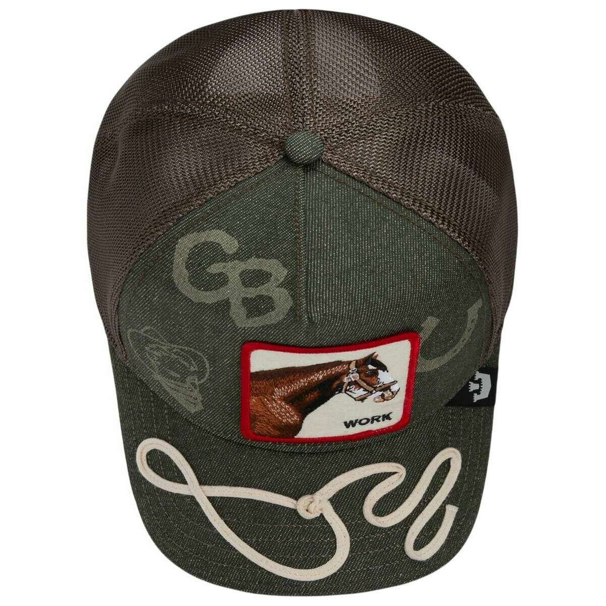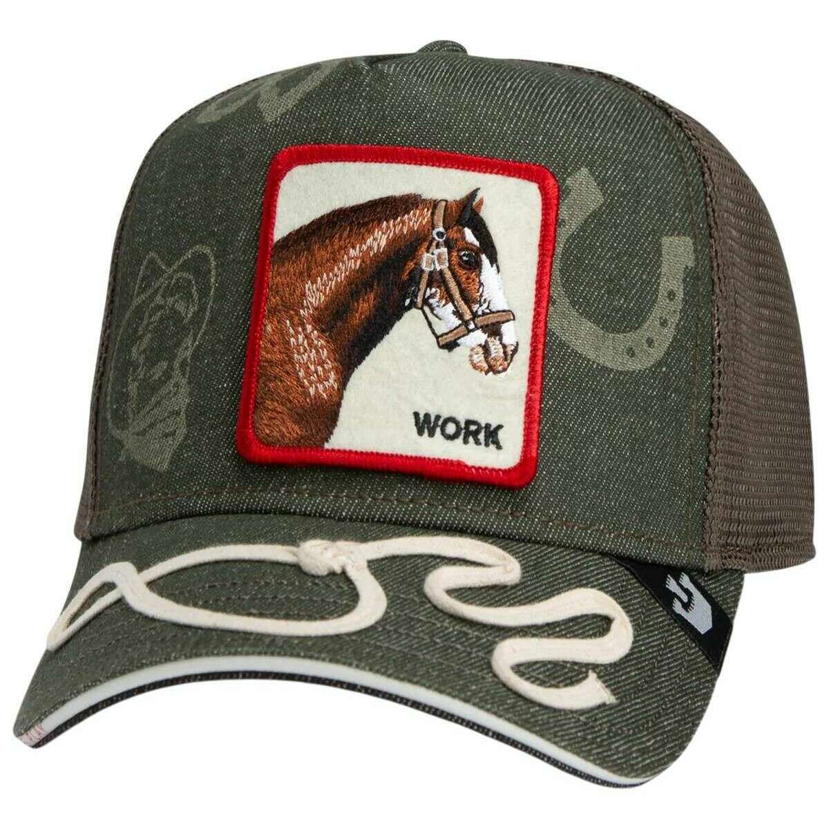 This double shift trucker hat for men or women is fashioned by the brand Goorin Bros in a green colour and is made from 57% polyester and 43% cotton. All the hats come complete with goorin bros tags. The Goorin Bros Double Shift Trucker Hat - Olive Green is made for those who don t boast about their strength they live it. With its deep olive?green tone, rugged denim?style material featuring a subtle horseshoe print, and the bold Workhorse patch, this cap brings together raw robustness and unmistakable cowboy spirit. The lasso embroidery on the brim adds an extra touch of craftsmanship, reinforcing the cap s strong character and attention to detail. Meanwhile, the breathable mesh back and adjustable snapback closure ensure lasting comfort and a perfect fit, no matter how hard the day s work or play might be. Designed for doers, not complainers, this cap delivers attitude without shouting. A statement piece for anyone who puts in the work and looks damn good doing it.