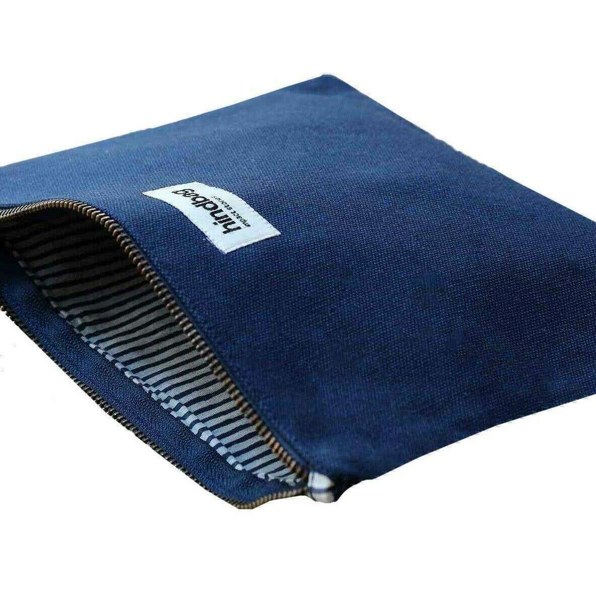 This ema medium zipped pouch for men or women is fashioned by the brand Hindbag in a navy colour and is made from 100% organic cotton. It measures 18cm(height) x 25cm(width). All the bags come complete with hindbag packaging. The Hindbag Ema Medium Zipped Pouch - Navy Blue is a modern, minimalistic and functional accessory designed for storing all your essential items, such as cards, cash and small personal belongings. This eco-friendly zipped pouch features a super strong YKK zipper and thick cotton to withstand all the hazards of everyday life. The handmade patterned lining adds a touch of elegance to this piece.