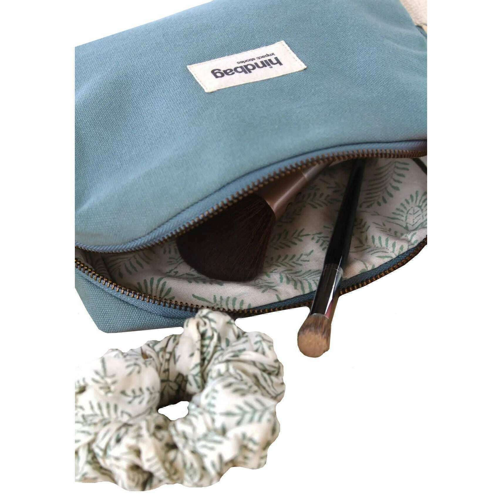 This leon toiletry bag for men or women is fashioned by the brand Hindbag in a green colour and is made from 100% organic cotton. It measures 16cm(height) x 22cm(width) x 8cm(depth). All the bags come complete with hindbag packaging. The Hindbag Leon Toiletry Bag - Sage Blue is a sleek and practical accessory designed for travellers and daily commuters who value both style and functionality. The practical handle ensures easy handling, and the secure zipper closure keeps your essentials safe. Lined with matching organic cotton in a block print pattern, this bag offers ample space for your toiletries without being bulky.