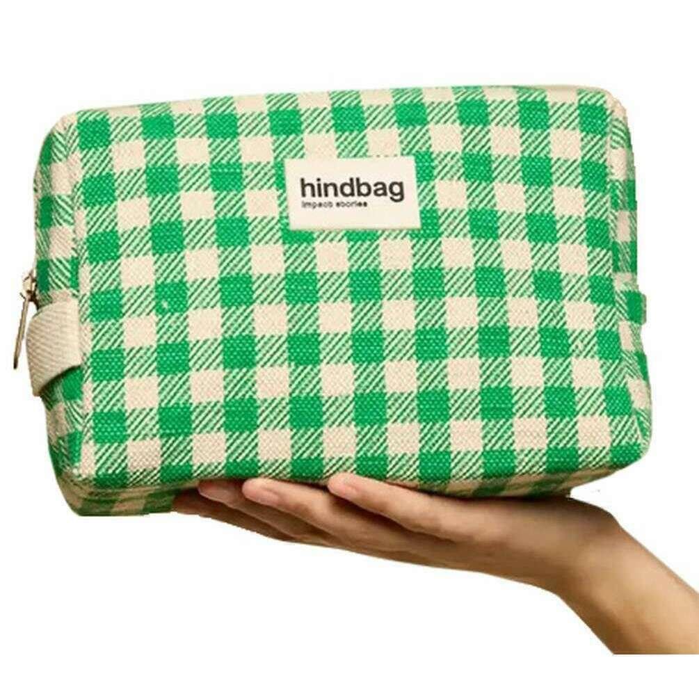Manufactured from 100% organic cotton is this vichy green unisex leon toiletry bag by the designer Hindbag. It measures 16cm(height) x 22cm(width) x 8cm(depth). All the bags come complete with hindbag packaging. The Hindbag Leon Toiletry Bag - Vichy Green is a sleek and practical accessory designed for travellers and daily commuters who value both style and functionality. The practical handle ensures easy handling, and the secure zipper closure keeps your essentials safe. Lined with matching organic cotton in a block print pattern, this bag offers ample space for your toiletries without being bulky.