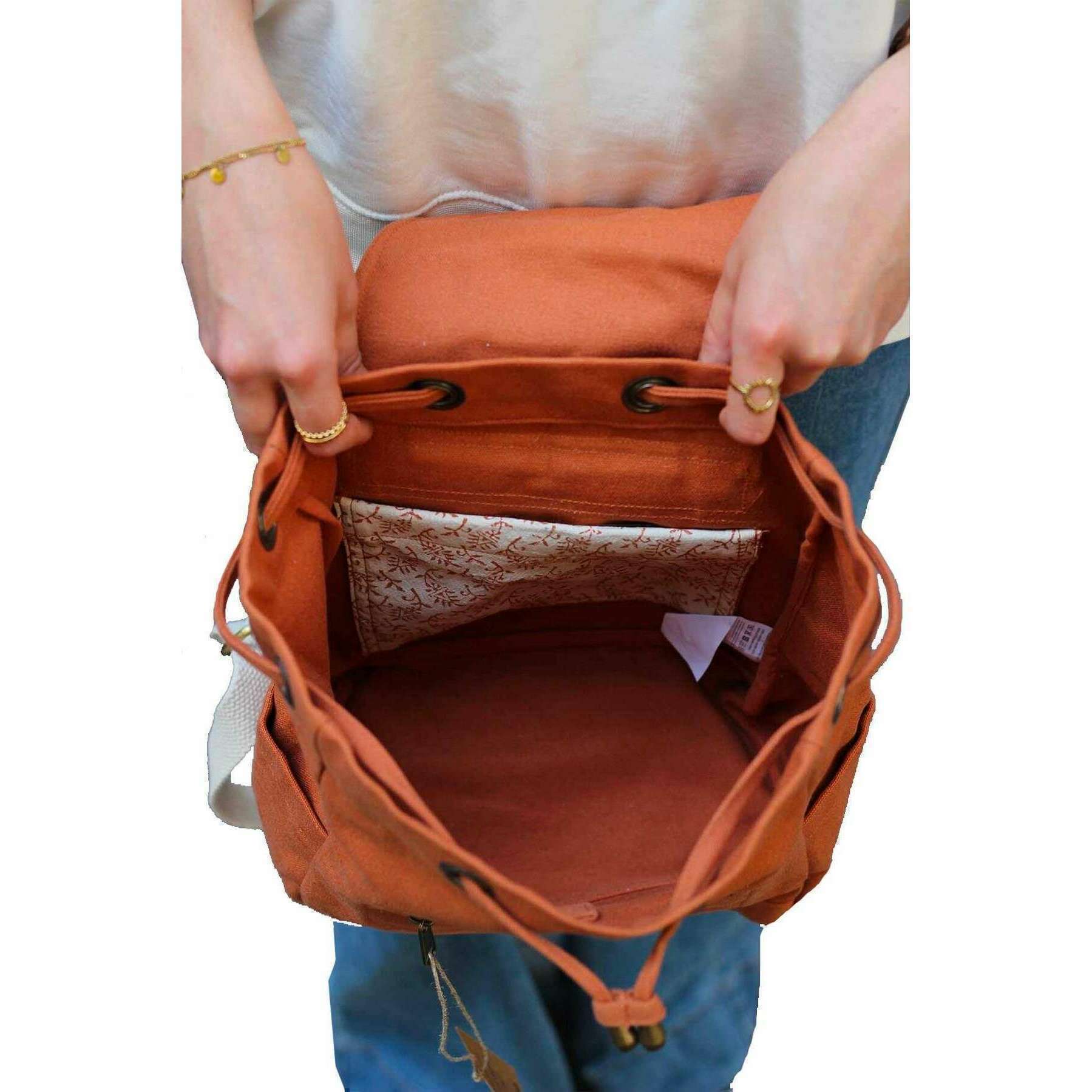 This unisex mini eliot small backpack has been made from 100% organic cotton, featured in a red colour and is from the brand Hindbag. It measures 31cm(height) x 24cm(width) x 13cm(depth). All the bags come complete with hindbag packaging. The Hindbag Mini Eliot Small Backpack - Sienna Orange is suitable for young and old alike! Featuring two exterior pockets and one interior pocket, you can slip in what you need while keeping your hands free. The timeless design of this mini backpack blend vintage charm with modern functionality, making them a popular choice for daily use.