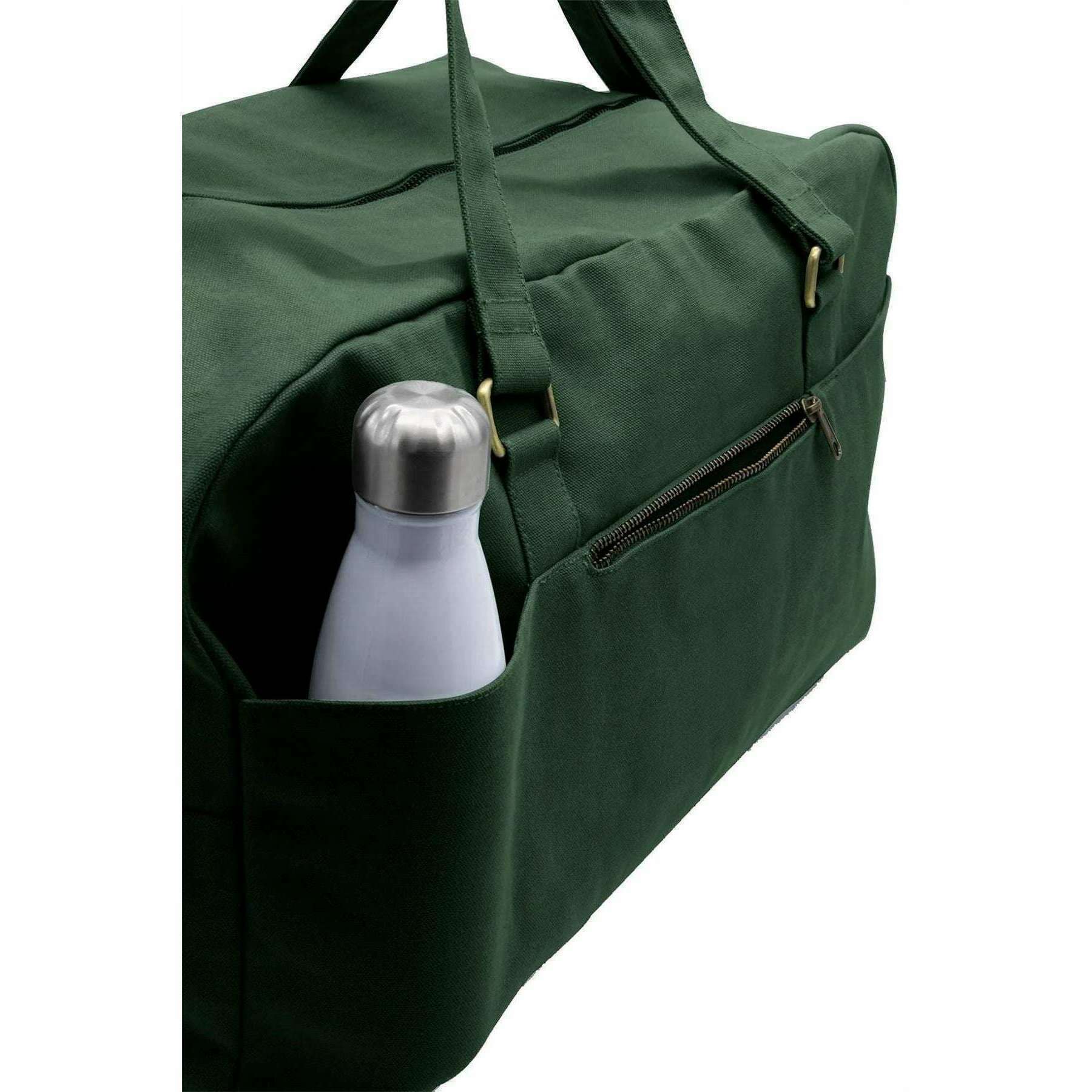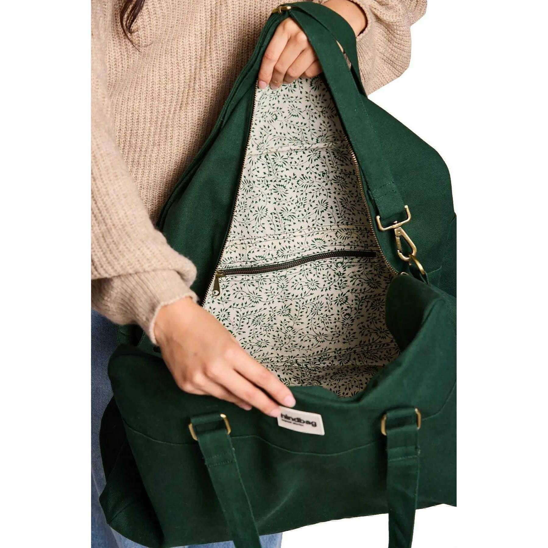 This unisex yves large travel bag has been made from 100% organic cotton, featured in a green colour and is from the brand Hindbag. It measures 33cm(height) x 54cm(width) x 24cm(depth). All the bags come complete with hindbag packaging. The Hindbag Yves Large Travel Bag - Forest Green is a spacious and eco-friendly option for travellers. Crafted from thick, GOTS-certified organic cotton, this bag features multiple pockets for organization, a secure zipper closure, and a printed inner lining that adds a touch of elegance. With its handles and large adjustable shoulder strap, this bag can be easily carried by hand or on the shoulder.