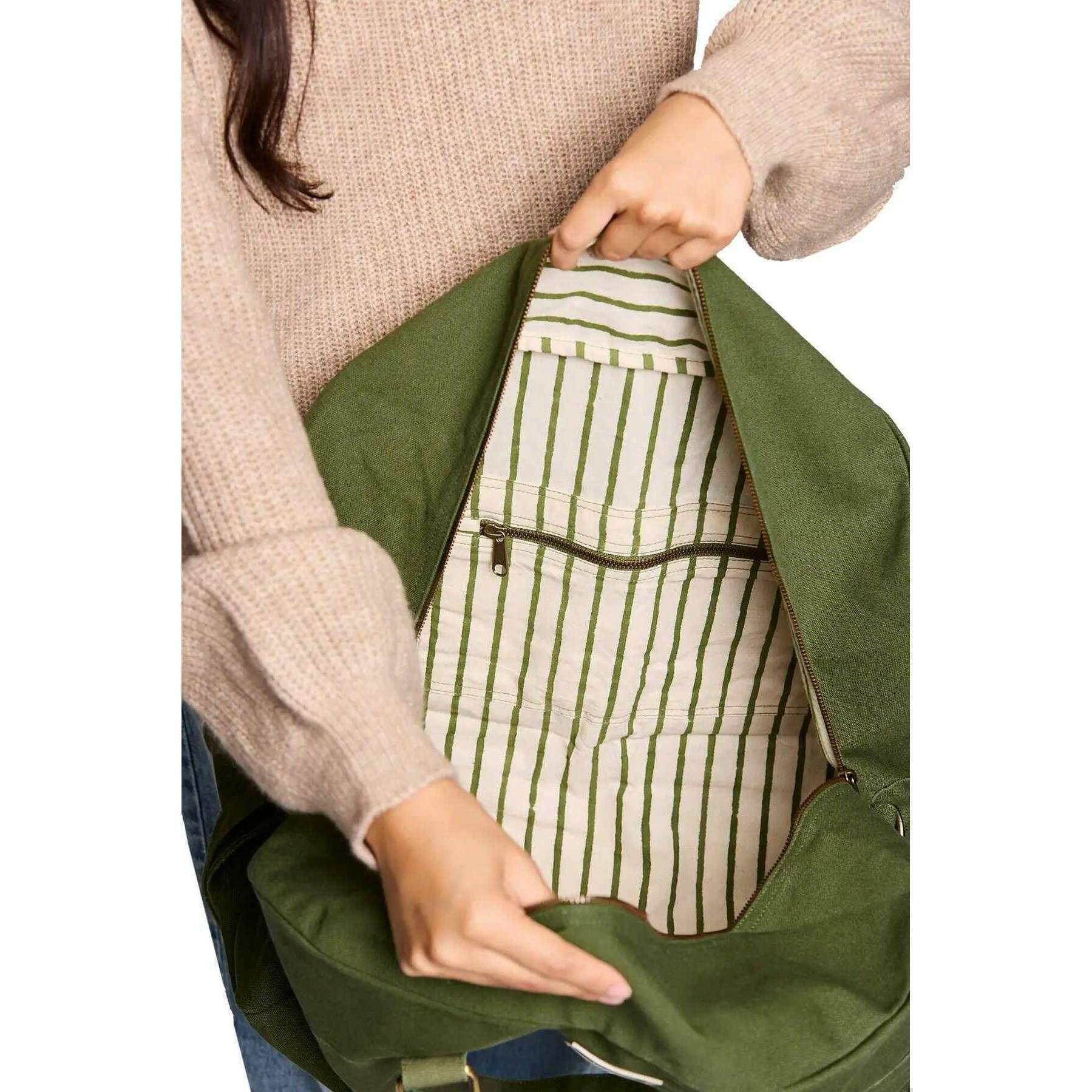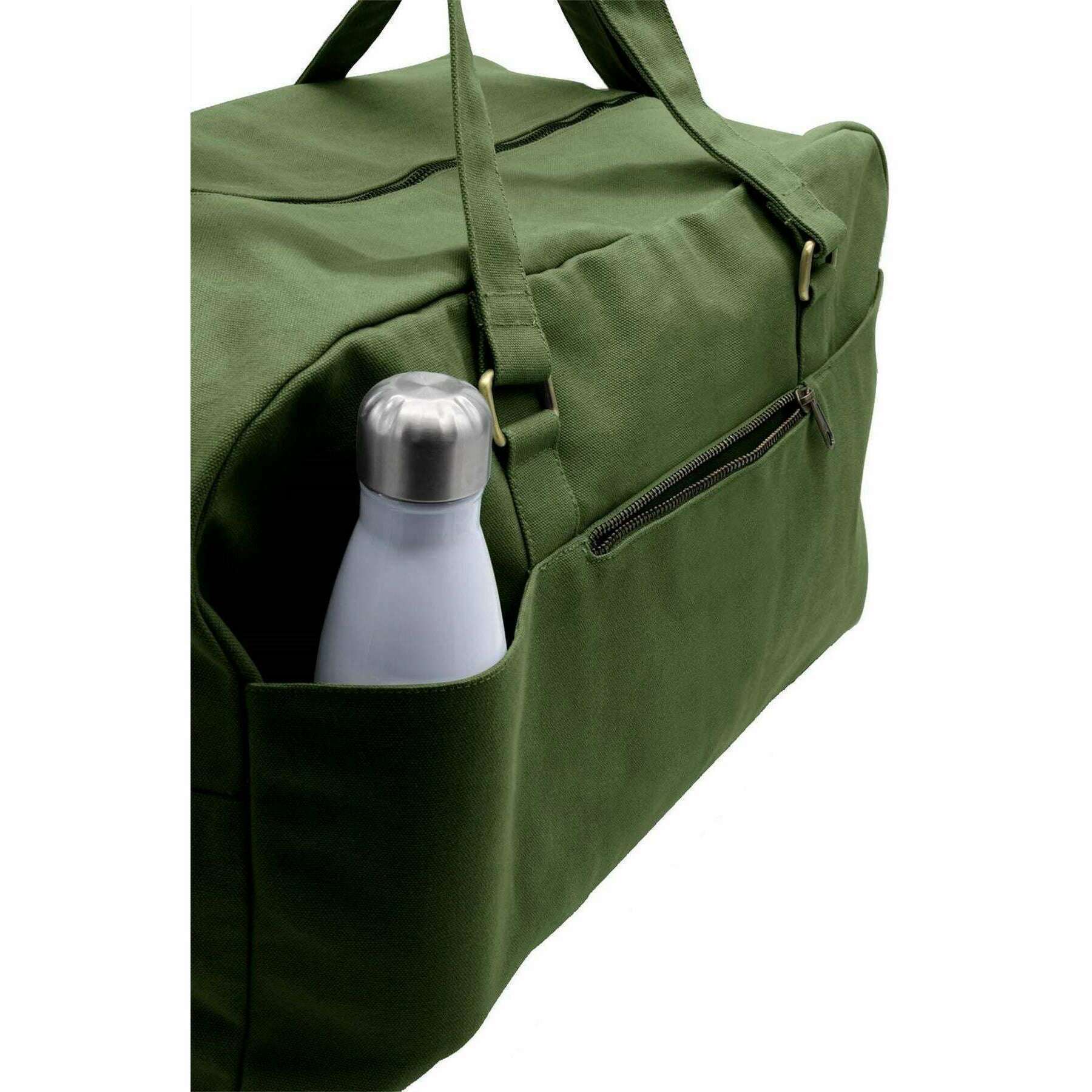 Manufactured from 100% organic cotton is this olive green unisex yves large travel bag by the designer Hindbag. It measures 33cm(height) x 54cm(width) x 24cm(depth). All the bags come complete with hindbag packaging. The Hindbag Yves Large Travel Bag - Olive Green is a spacious and eco-friendly option for travellers. Crafted from thick, GOTS-certified organic cotton, this bag features multiple pockets for organization, a secure zipper closure, and a printed inner lining that adds a touch of elegance. With its handles and large adjustable shoulder strap, this bag can be easily carried by hand or on the shoulder.