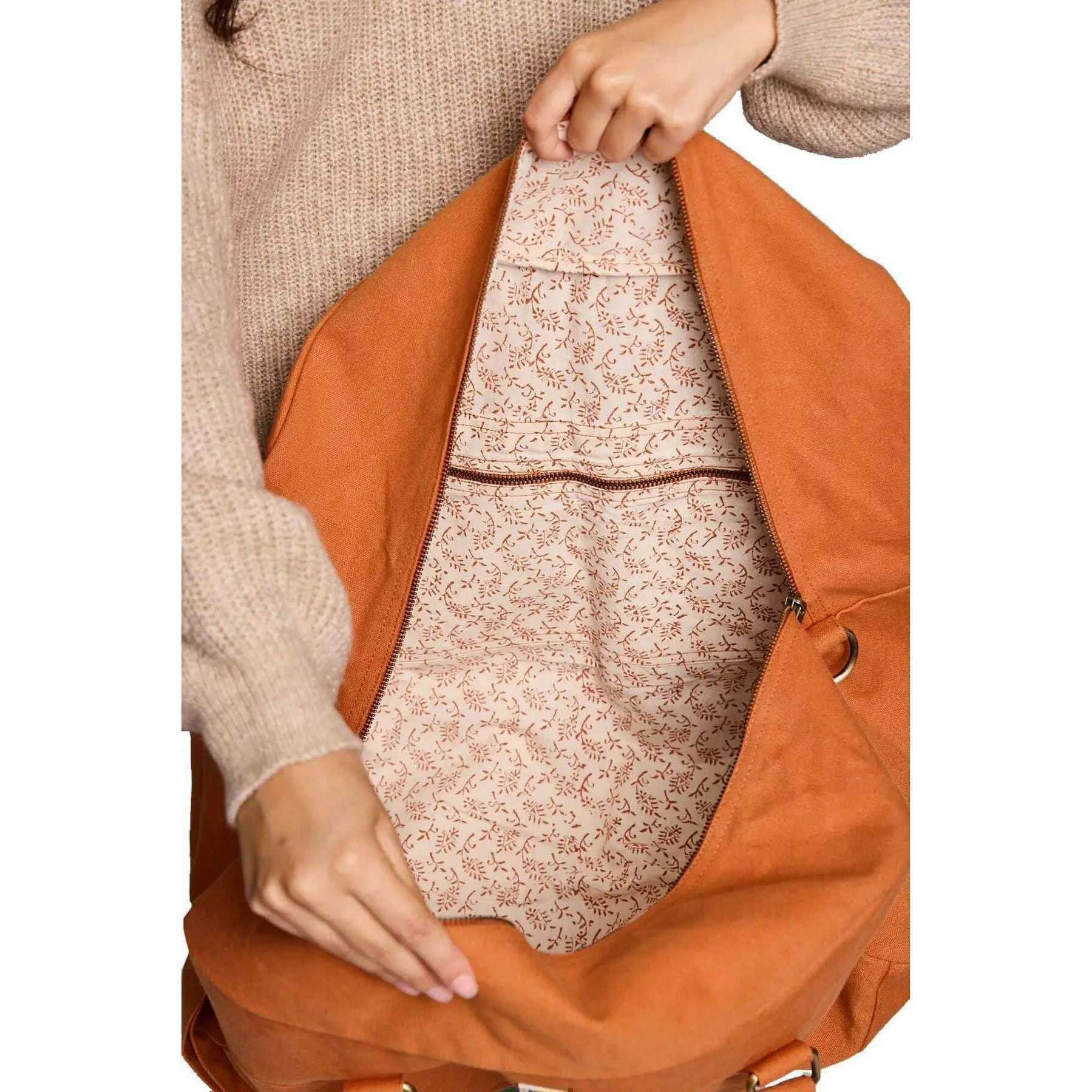 Perfect for men or women is this Hindbag sienna orange yves large travel bag, it is also made from 100% organic cotton. It measures 33cm(height) x 54cm(width) x 24cm(depth). All the bags come complete with hindbag packaging. The Hindbag Yves Large Travel Bag - Sienna Orange is a spacious and eco-friendly option for travellers. Crafted from thick, GOTS-certified organic cotton, this bag features multiple pockets for organization, a secure zipper closure, and a printed inner lining that adds a touch of elegance. With its handles and large adjustable shoulder strap, this bag can be easily carried by hand or on the shoulder.