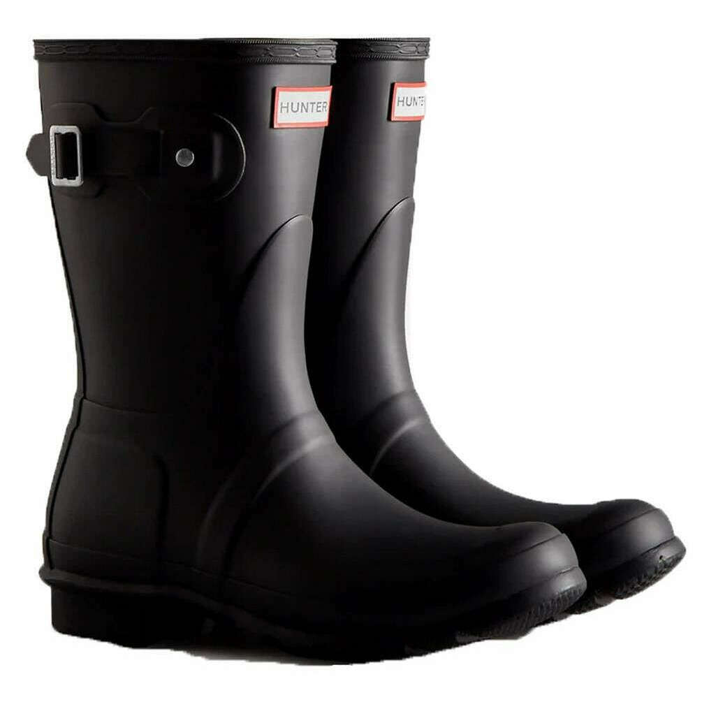 This women's original short wellington boots by the brand Hunter is made from 100% rubber and is showcased in black. All the wellington boots come complete with hunter packaging. The Hunter Original Short Wellington Boots - Black offers a compact version of Hunter s iconic Tall Boot, designed for reliable wet?weather protection. Each pair is handcrafted from 28 natural rubber parts and assembled over three days before being vulcanised for durability and waterproof performance. The boot features a matte finish, the Hunter Original tread pattern, and an updated recycled polyester lining and insole for added comfort. Specially engineered to repel water and prevent moisture seepage, this certified vegan boot is an essential choice for rainy days.