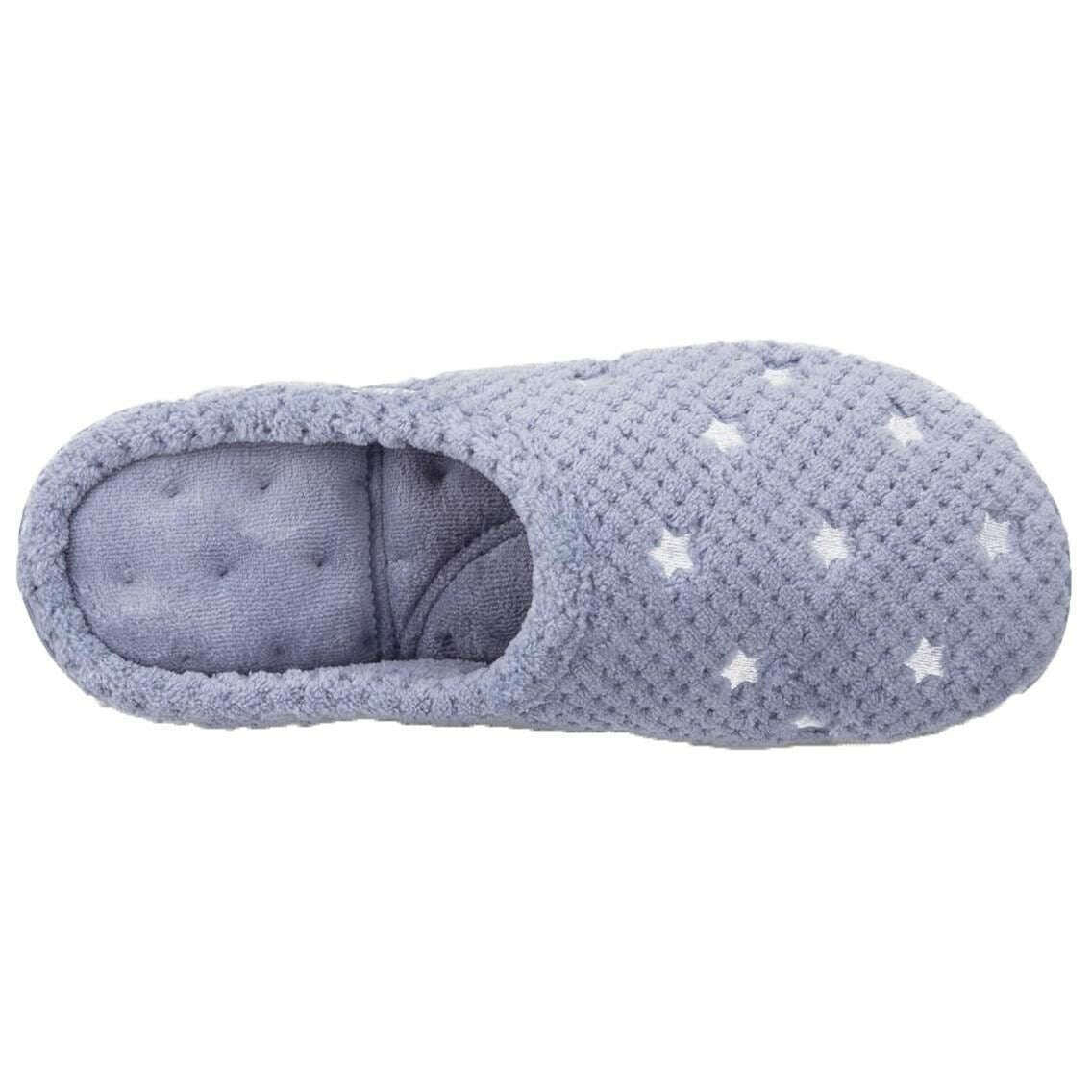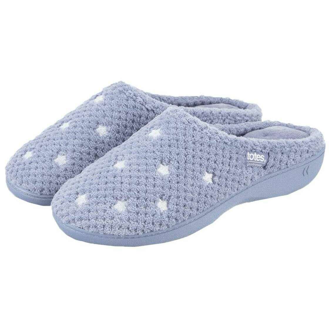 Introducing these women's popcorn terry mule slippers by Isotoner, they are manufactured from 100% polyester in a iris blue star colour. Also the iris blue star slippers are designed in a unique pattern, It is recommended to machine wash at 30 degrees to keep these slippers in good condition. All the slippers come complete with isotoner packaging. The Isotoner Popcorn Terry Mule Slippers - Iris Blue Star offer exceptional comfort, support and warmth! Featuring 360 surround comfort memory foam and pillow step cushioned technology with a foam layer will feel like you re walking on a cloud with the extra secret sole for support of the heel, arch and toes. This mule style will keep your feet nice and toasty with the soft fluffy materials and coverage of the foot, whilst also being breathable with an open back.