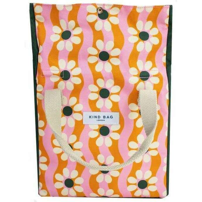 Manufactured from 100% recycled plastic is this wavy daisy orange/green/pink women's lunch bag by the designer Kind Bag London. It measures 33cm(height) x 22cm(width) x 14cm(depth). It is recommended to machine wash at 30degrees on a delicate setting and do not tumble dry to keep this bag in good condition. All the bags come complete with kind bag packaging. The Kind Bag London Lunch Bag - Wavy Daisy Orange/Green/Pink made from recycled materials is perfect for taking to work, school or for a picnic to create a more fun and enjoyable snack time. The magnetic roll top with button closures creates a secure closure and wide opening for easy access, the interior pockets are great for organising your snacks and cutlery and the button fastened handles are great for convenience when transporting. This lunch bag is BPA free and has no PFA coatings.