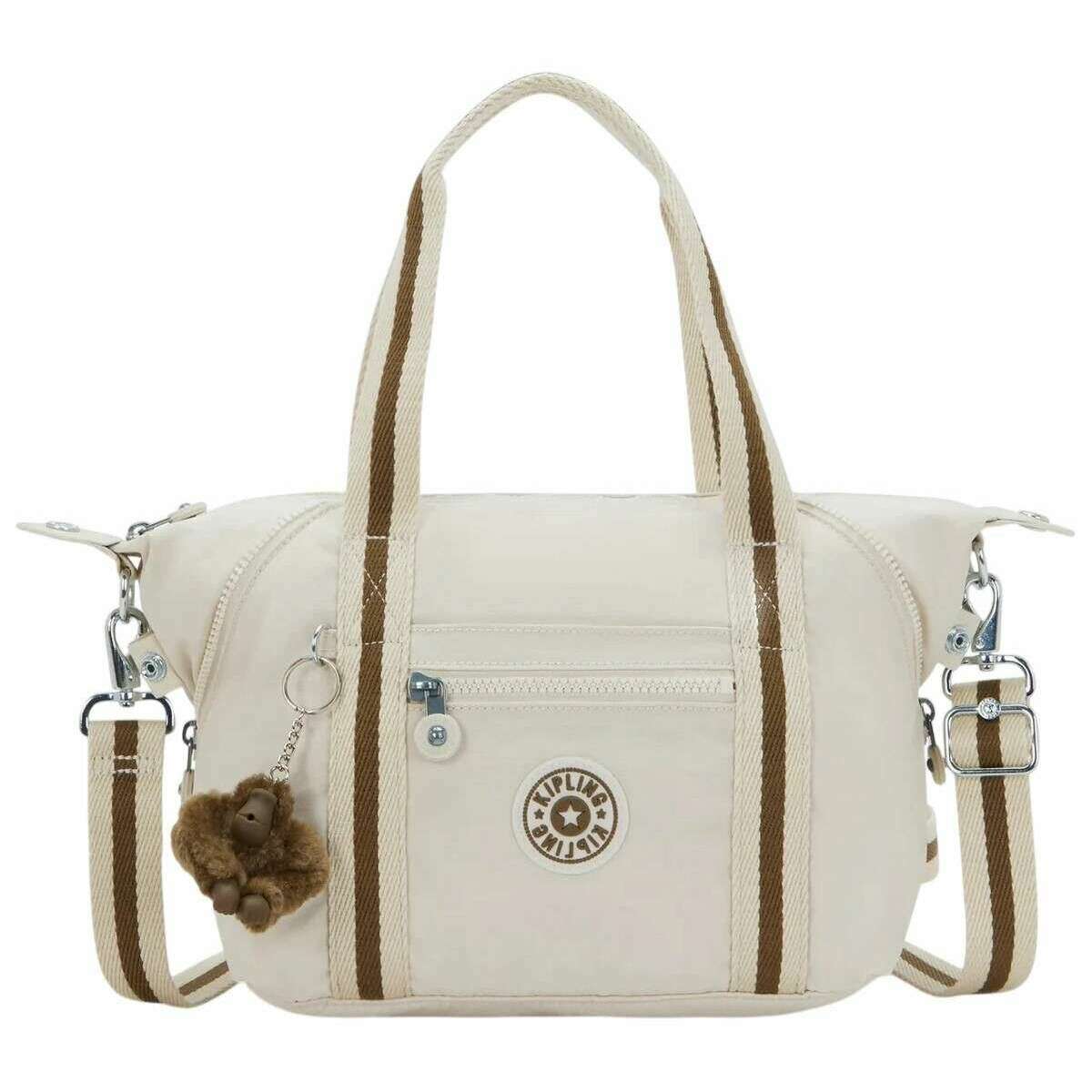 Perfect for women is this Kipling soft sand cream art mini tote bag, it is also made from 60% polyamide and 40% recycled polyamide. It measures 20cm(height) x 39cm(width) x 18.5cm(depth). All the bags come complete with kipling packaging. The Kipling Art Mini Tote Bag - Soft Sand Cream is a versatile everyday companion designed to adapt to the wearer s needs. With adjustable corners that change the size and silhouette in an instant, it offers effortless flexibility whether used for daily errands, work, or weekend outings. Despite its compact look, this lightweight tote is surprisingly roomy, featuring a zipped main compartment and thoughtfully arranged pockets that keep essentials organised on the go. The interior includes a zipped pocket along with dedicated phone, pen, and wallet compartments for easy access to smaller items. On the outside, one zipped and one open front pocket add convenient storage for items needed quickly. The bag can be carried by its dual top handles for a classic look, or the wearer can unzip the corners, attach the removable and adjustable strap, and switch to a hands?free shoulder or crossbody style. Finished with a water?repellent coating, Kipling s signature monkey, and the iconic round Kipling logo, the Art Mini offers a winning combination of practicality, durability, and playful charm.