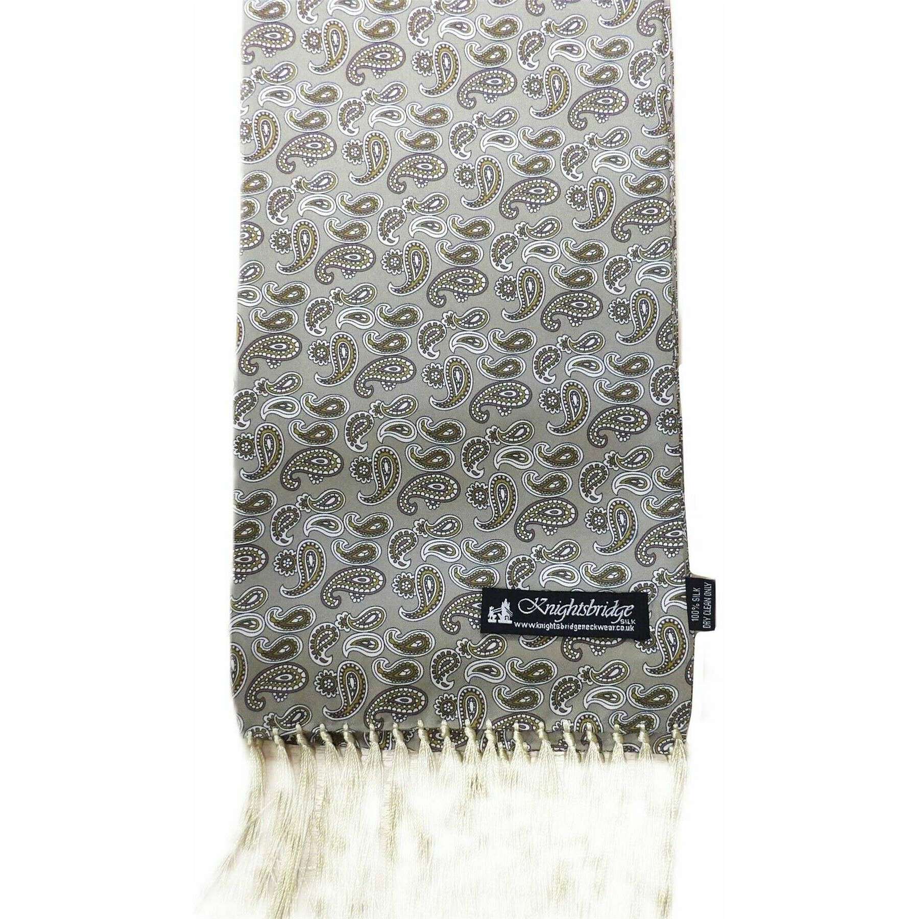 This well made men's paisley silk scarf from Knightsbridge Neckwear comes in a beige/gold colour and is manufactured from 100% silk. It measures 145cm(height) x 18cm(width). Also the beige/gold scarf is designed in a paisley pattern, It is recommended to dry clean only to keep this scarf in good condition. All the scarves come complete with knightsbridge neckwear tags. The Knightsbridge Neckwear Paisley Silk Scarf - Beige/Gold is a luxurious beige and gold paisley scarf that is sure to draw attention. Being crafted from the finest of silk ensures that you get maximum comfort and a lasting product. The ideal accessory for formal occasions, this truly unique scarf will make the perfect present for any man.