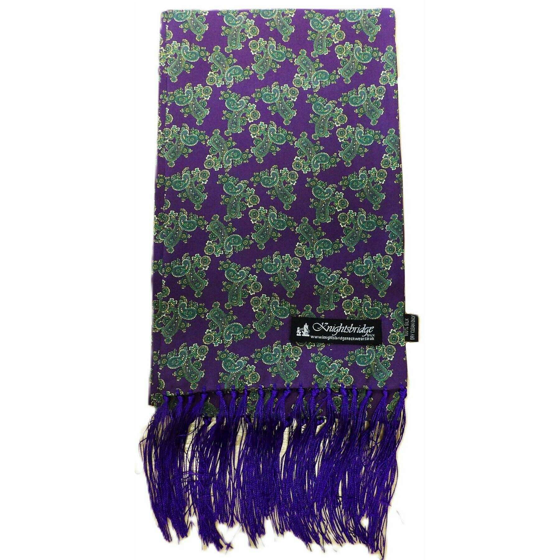 Manufactured from 100% silk is this purple/green men's paisley silk scarf by the designer Knightsbridge Neckwear. It measures 145cm(height) x 18cm(width). Also the purple/green scarf is designed in a paisley pattern, It is recommended to dry clean only to keep this scarf in good condition. All the scarves come complete with knightsbridge neckwear tags. The Knightsbridge Neckwear Paisley Silk Scarf - Purple/Green is a luxurious purple and green paisley scarf that is sure to draw attention. Being crafted from the finest of silk ensures that you get maximum comfort and a lasting product. The ideal accessory for formal occasions, this truly unique scarf will make the perfect present for any man.