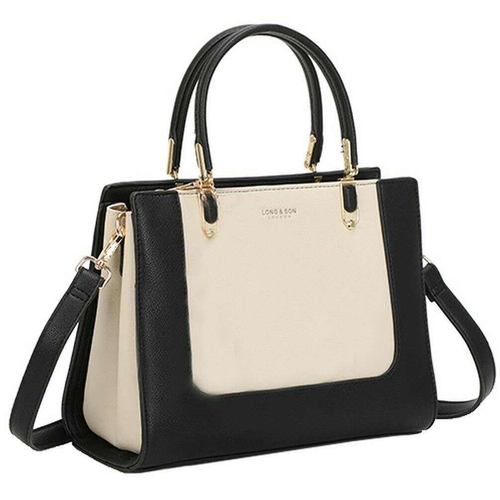 This women's crossbody handbag has been made from 100% polyurethane, featured in a beige colour and is from the brand Long and Son. It measures 20cm(height) x 27cm(width) x 9cm(depth). All the bags come complete with long & son packaging. The Long and Son Crossbody Handbag - Black/Beige sophisticated and girly is a must have if you are looking for a chic everyday bag to dress up any attire. Featuring two separate compartments for organisation and one open and one zipped internal pocket for more storage. The zipped top ensures a secure wear to ensure your belongings are kept safe when out and about. This bag doubles up as a hand bag and a crossbody bag with the simple attachment of the adjustable strap.