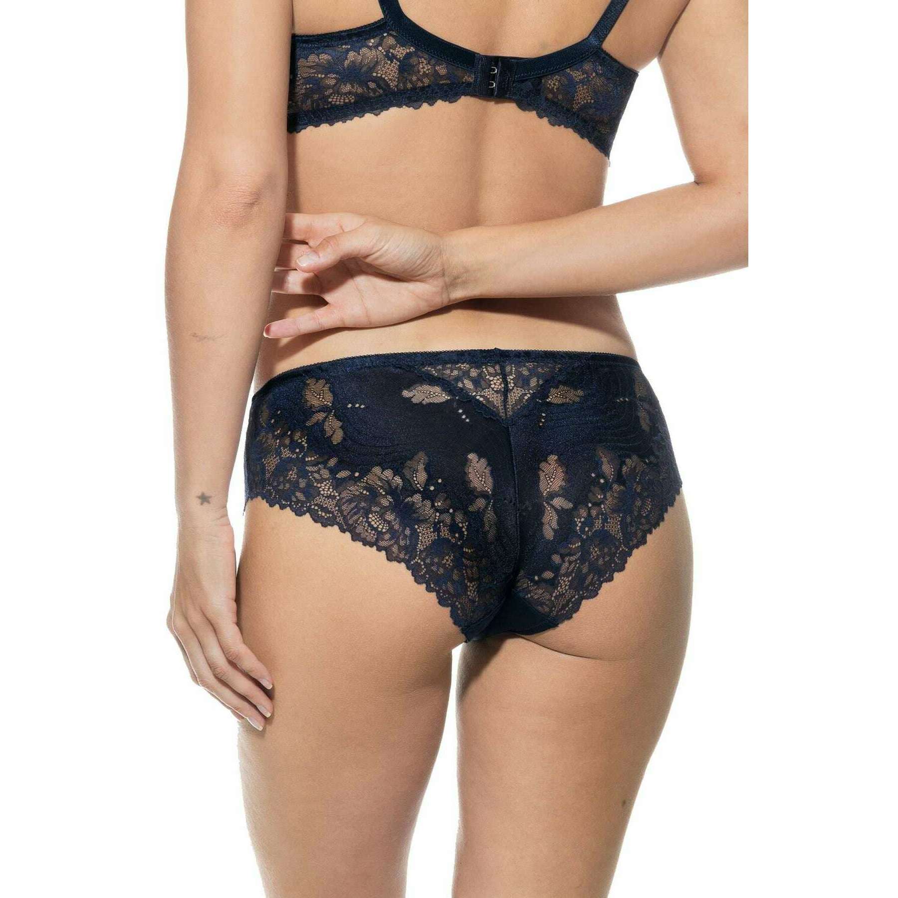 Brought to you by the brand Mey, this night blue women's luxurious hipster briefs is made from 87% polyamide and 13% elastane. Also the night blue underwear is designed in a plain pattern, It is recommended to machine wash at 30 degrees to keep this underwear in good condition. All the underwear comes complete with mey packaging. The Mey Luxurious Hipster Briefs - Night Blue are a must-have if you are looking for a basic with a gorgeous touch for a feminine feel. This pair has a mid rise fit, a cotton insert on the gusset, seamless legs and a flat waistband which all contribute to giving optimal comfort for an everyday wear. The all over lace gives an elegant sexy flair.