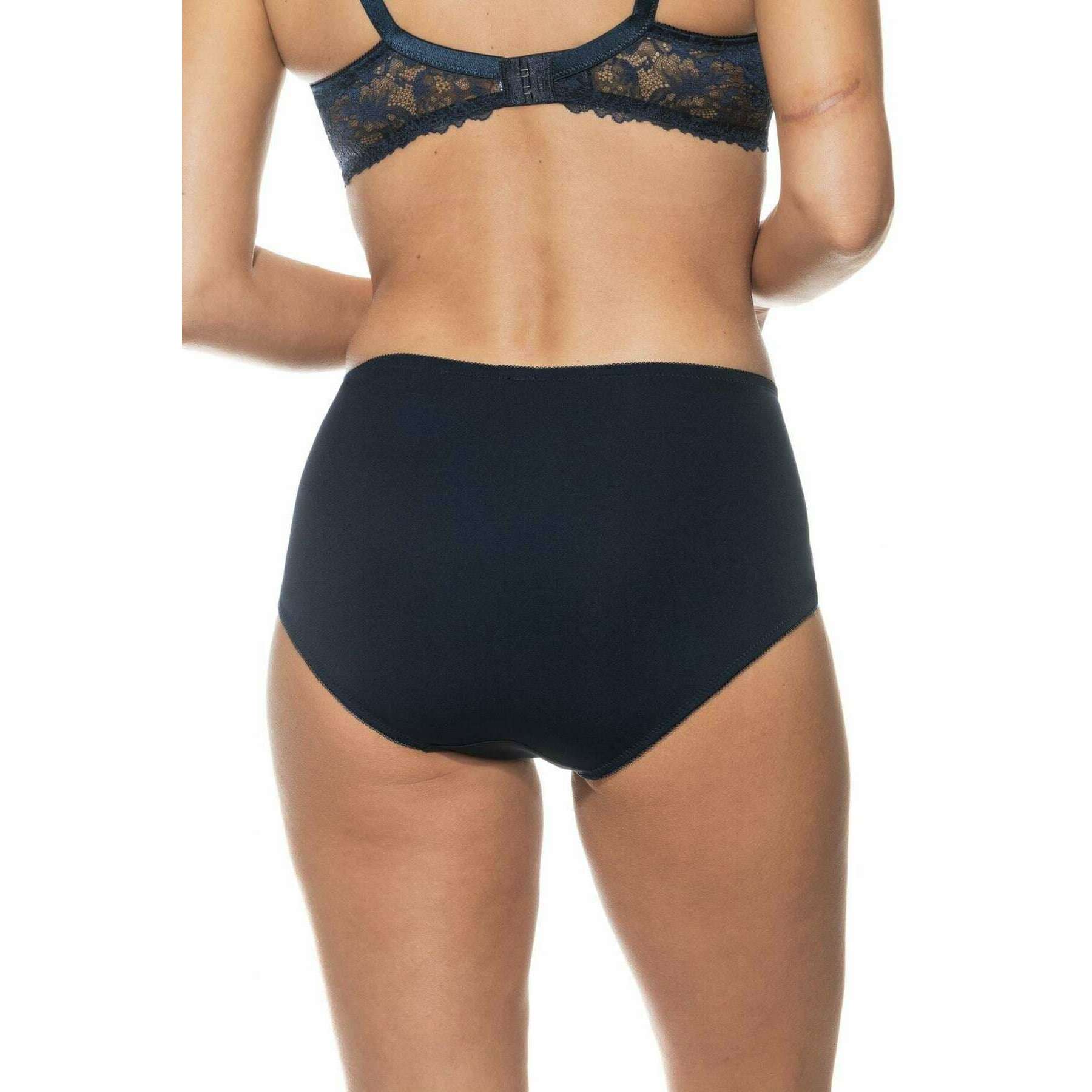 Perfect for women is this Mey night blue luxurious waist pants, it is also made from 87% polyamide and 13% elastane. Also the night blue underwear is designed in a plain pattern, It is recommended to machine wash at 30 degrees to keep this underwear in good condition. All the underwear comes complete with mey packaging. The Mey Luxurious Waist Pants - Night Blue are a must-have if you are looking for a basic with a gorgeous touch for a feminine feel. This pair has a high-waisted fit, a cotton insert on the gusset, seamless legs and a flat waistband which all contribute to giving optimal comfort for an everyday wear. The lace front gives an elegant sexy flair.