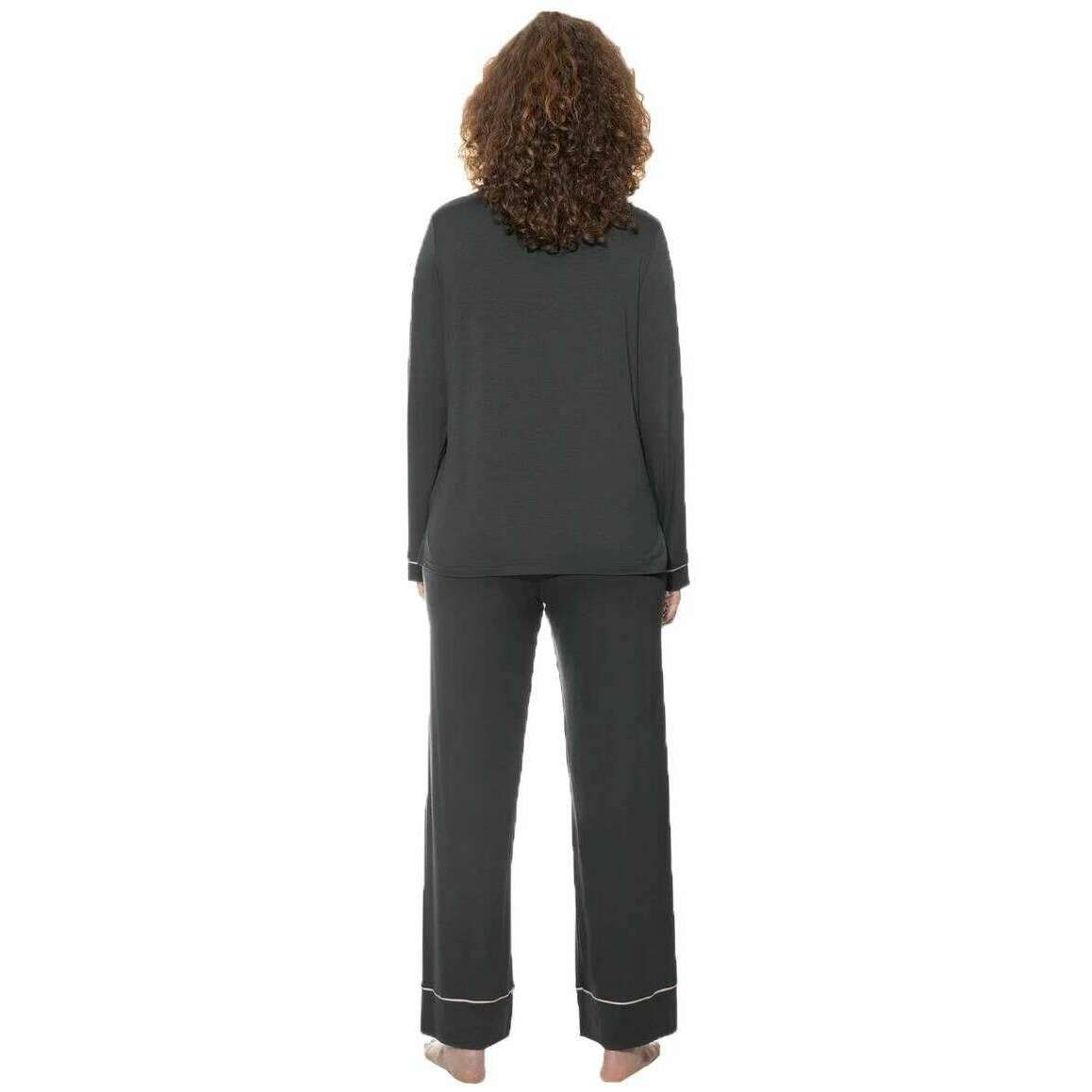 Introducing these women's pure chic full length pyjamas by Mey, they are manufactured from 94% modal and 6% elastane in a thunder grey colour. Also the thunder grey pyjamas are designed in a plain pattern, Mey have made these pure chic full length pyjamas in Portugal. It is recommended to machine wash at 40 degrees on a gentle cycle, not suitable for tumble drying to keep these pyjamas in good condition. All the pyjamas come complete in mey packaging. The Mey Pure Chic Full Length Pyjamas - Thunder Grey will certainly elevate your loungewear to keep you looking stylish whilst very comfortable, adding a bit of luxury to your down time. Crafted from modal and elastane ensure warmth whilst being breathable and a skin-friendly wear. The wide leg fit allows freedom of movement and a non-restrictive wear whilst the elastic waistband with adjustable drawstring allows for the perfect fit. This shirt is fully buttoned with a reversible collar and long sleeved. Completing this set is the decorative piping details.