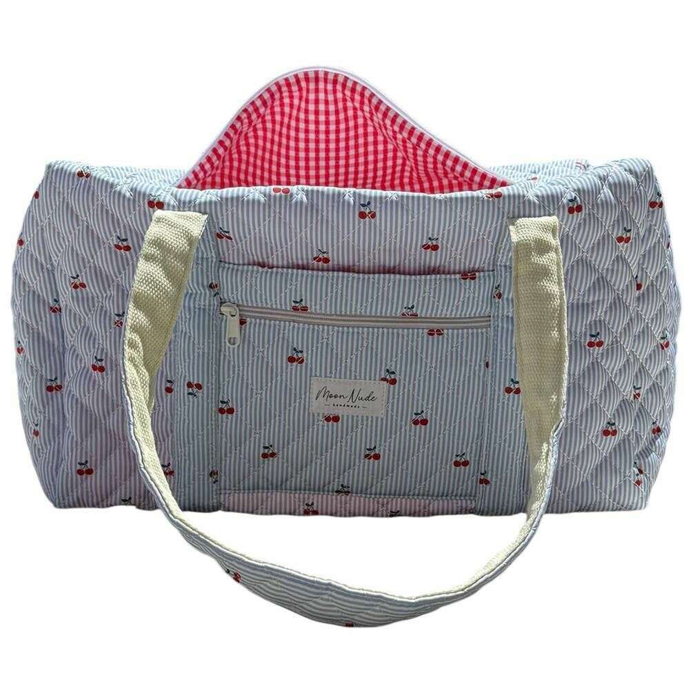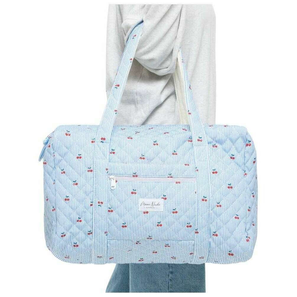 Perfect for women is this Moon Nude blue/white/red cherry large duffel bag, it is also made from 100% cotton. It measures 30cm(height) x 50cm(width) x 28cm(depth). It is recommended to wash by hand in cold water with a mild detergent, or maching wash inside out on a delicate cycle. to keep this bag in good condition. All the bags come complete with moon nude packaging. The Moon Nude Cherry Large Duffel Bag - Blue/White/Red features a beautiful handmade quilted design. This bag features an exterior zip pocket, a spacious interior and two large handles, perfect for weekend getaways or carrying lots of belongings.