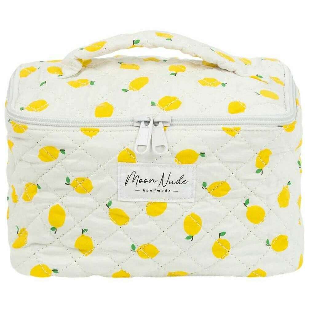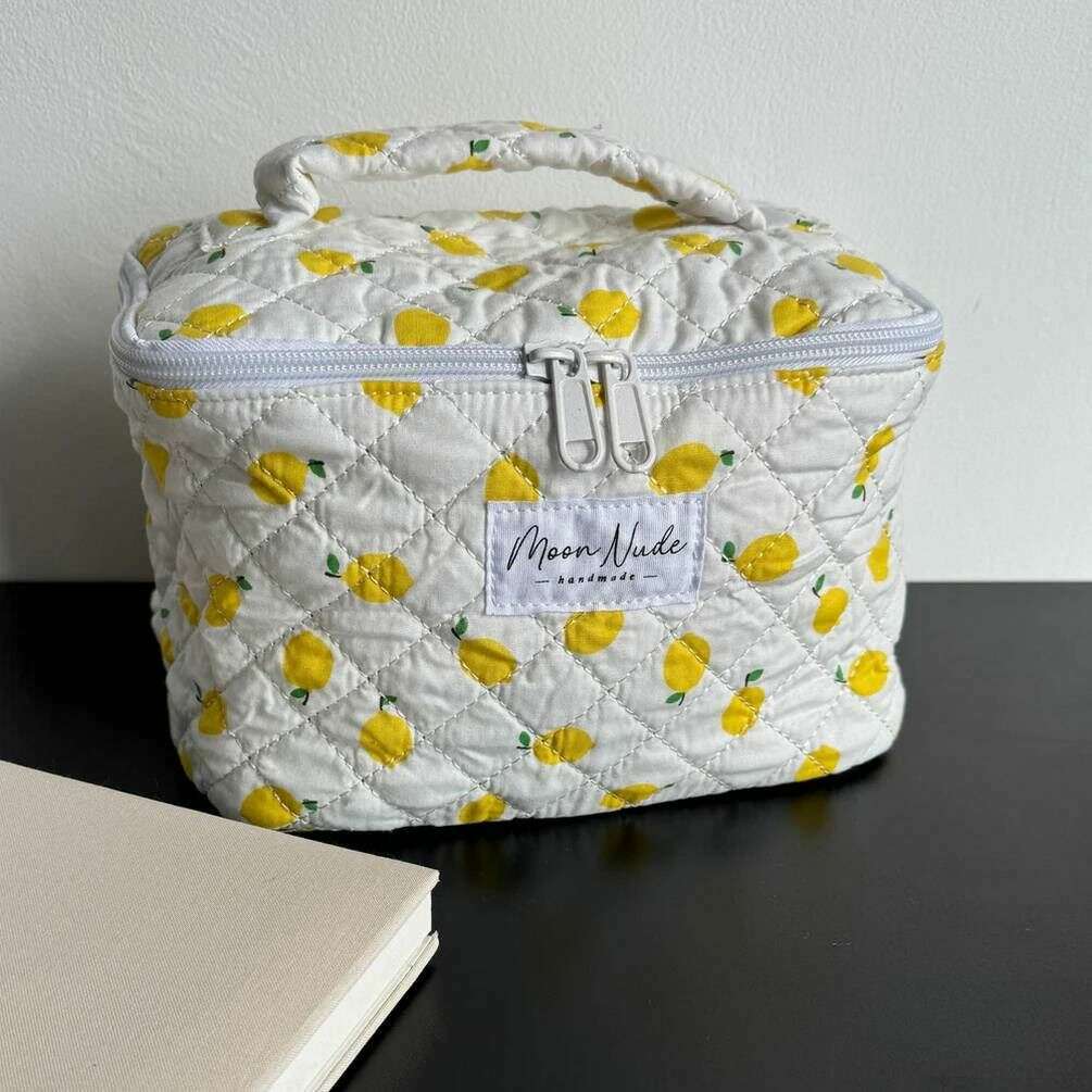 This women's lemonade vanity bag by the brand Moon Nude is made from 100% cotton and is showcased in white. It measures 16cm(height) x 22cm(width) x 14cm(depth). It is recommended to wash by hand in cold water with a mild detergent, or maching wash inside out on a delicate cycle. to keep this bag in good condition. All the bags come complete with moon nude packaging. The Moon Nude Lemonade Vanity Bag - White/Yellow is an absolute necessity for travelling or everyday use. This vanity bag is guaranteed to keep all your makeup or skin care in one place, whilst also being stylish and fashionable with its handmade quilted design.