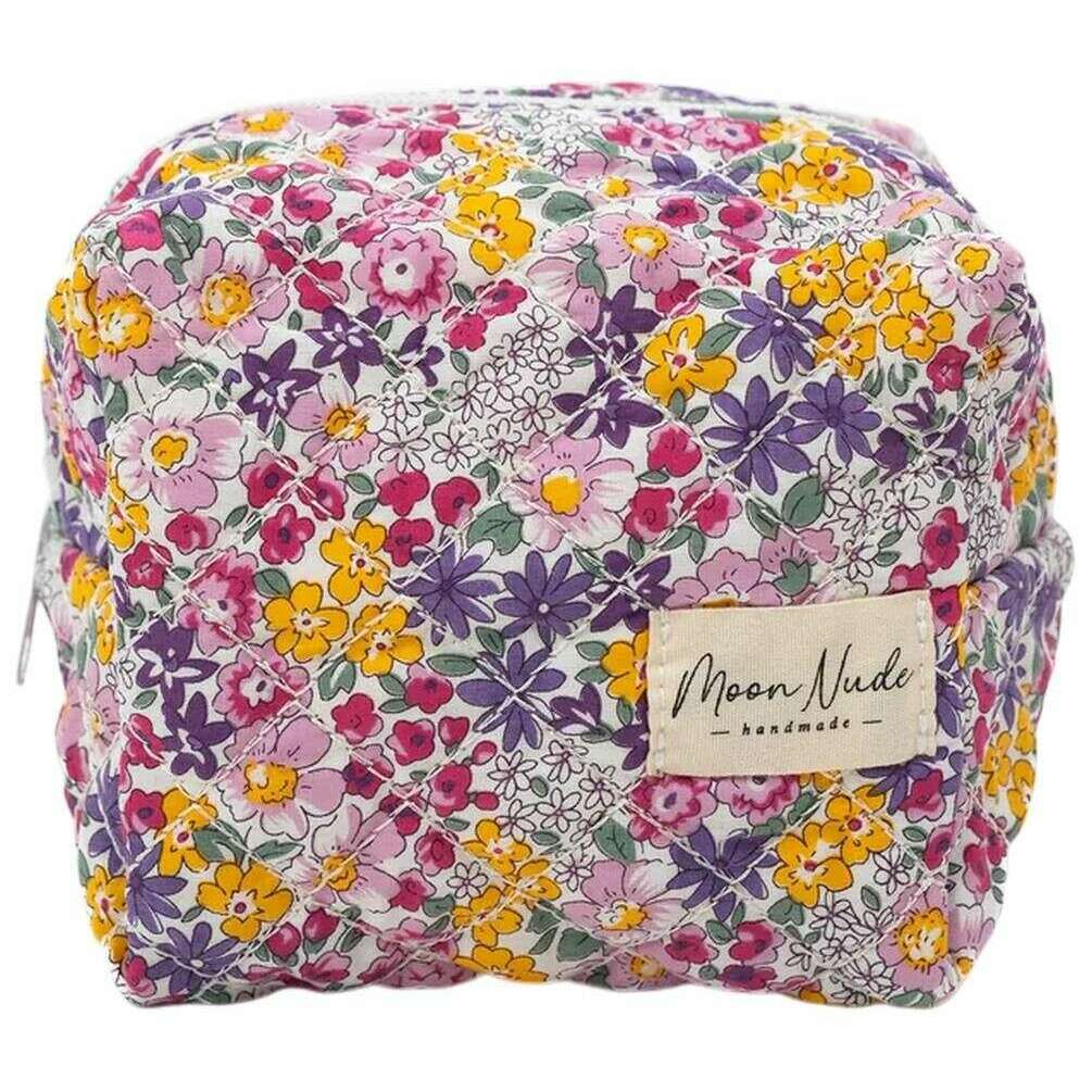 This well made women's summer mini makeup bag from Moon Nude comes in a purple/yellow/pink colour and is manufactured from 100% cotton. It measures 13cm(height) x 15cm(width) x 11cm(depth). It is recommended to wash by hand in cold water with a mild detergent, or maching wash inside out on a delicate cycle. to keep this bag in good condition. All the bags come complete with moon nude packaging. The Moon Nude Summer Mini Makeup Bag - Purple/Yellow/Pink is an absolute necessity for your room or everyday bag. This makeup bag is guaranteed to keep all your most used products together and safe, whilst also being stylish and chic with its handmade quilted design.