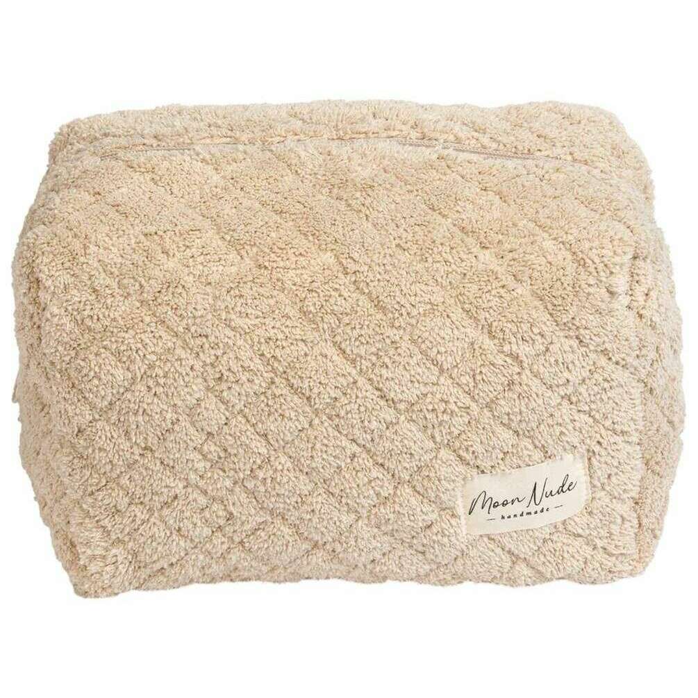 This women's teddy large makeup bag has been made from 100% cotton, featured in a beige colour and is from the brand Moon Nude. It measures 15cm(height) x 25cm(width) x 15cm(depth). It is recommended to wash by hand in cold water with a mild detergent, or maching wash inside out on a delicate cycle. to keep this bag in good condition. All the bags come complete with moon nude packaging. The Moon Nude Teddy Large Makeup Bag - Beige is an absolute necessity for your room or everyday bag. This makeup bag is guaranteed to keep all your most used products together and safe, whilst also being stylish and chic with its handmade quilted design.
