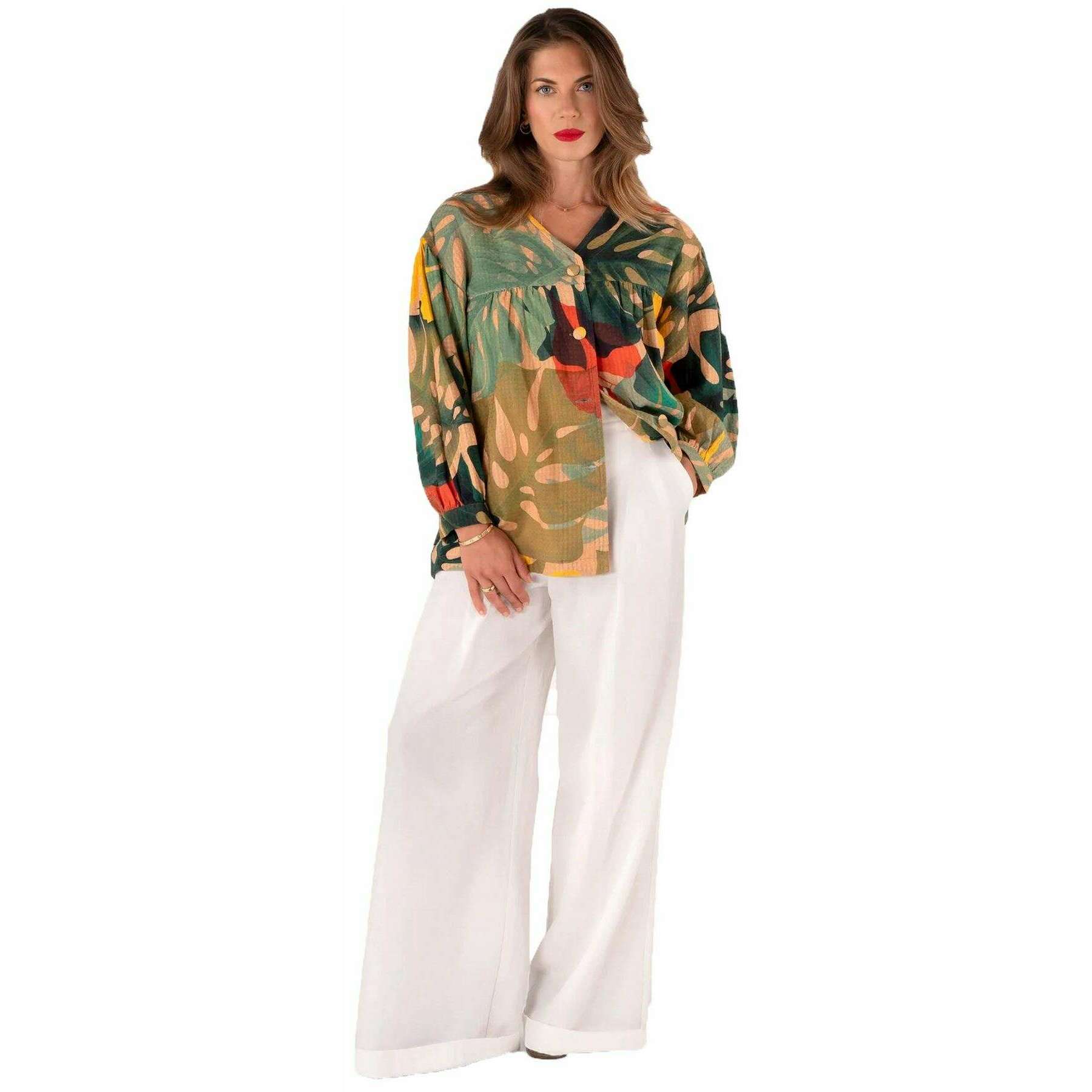 • Hemmed Sleeves , Button Up , V-Neck Collar