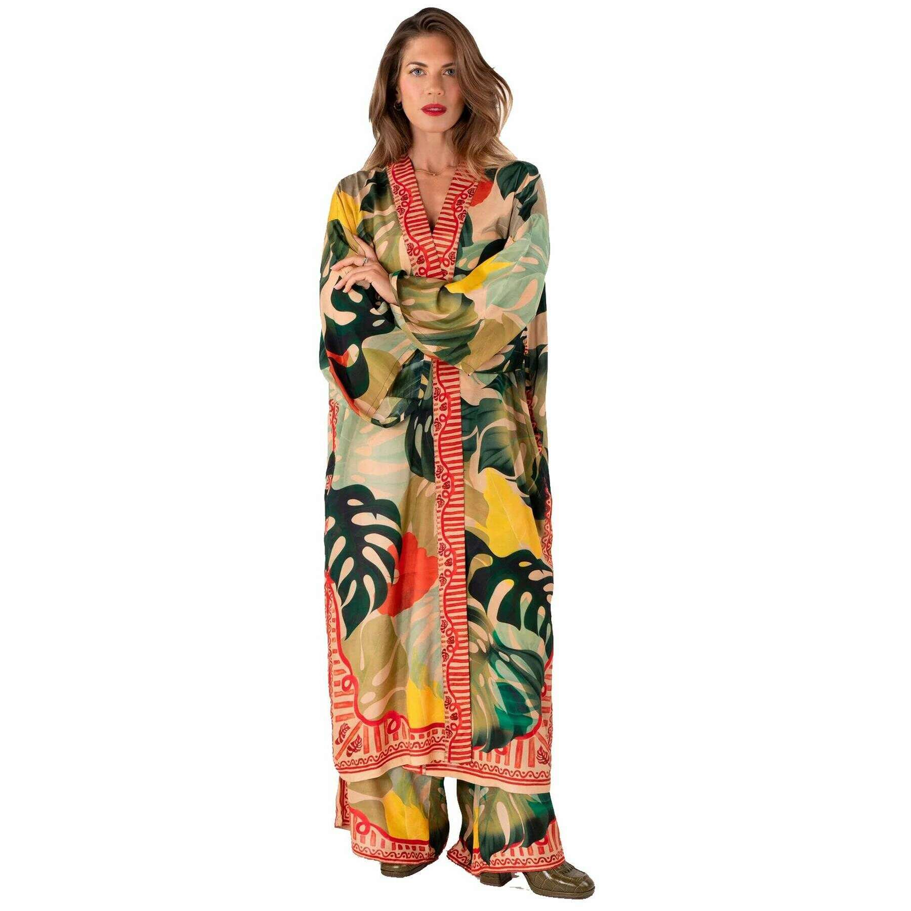 Powder Exotic Leaves Kimono Gown - Green/Beige/Yellow