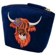 Powder Highland Cow Embroidered Velvet Mini Pouch - Navy Blue/Orange/Beige