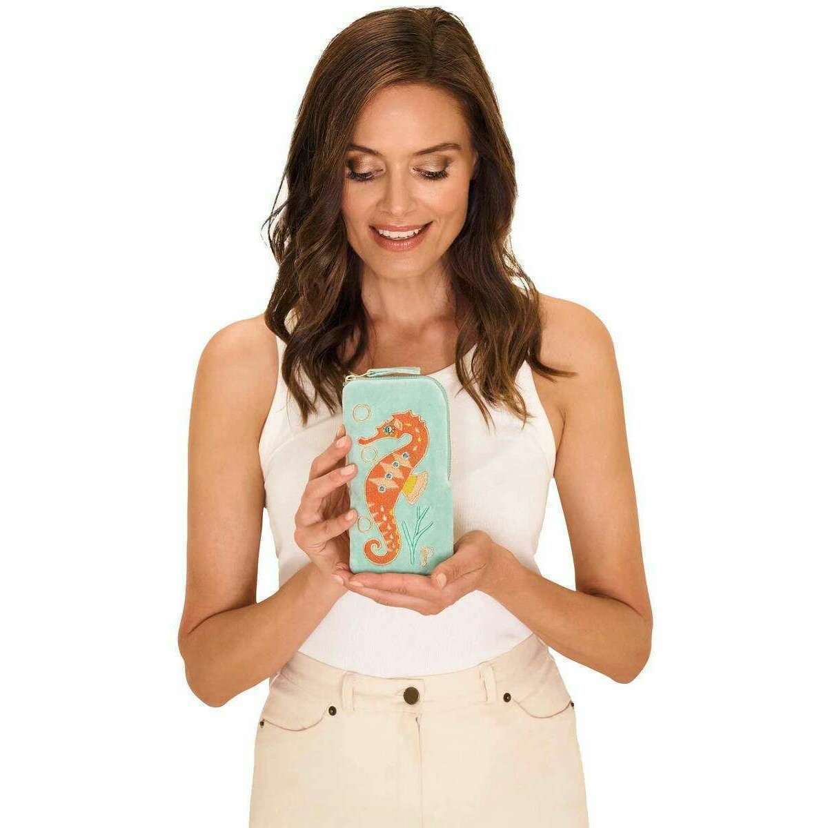 This women's sparkling seahorse velvet sunglasses case has been made from 100% polyester velvet, featured in a blue colour and is from the brand Powder. All the accessory cases come complete with powder tags. The Powder Sparkling Seahorse Velvet Sunglasses Case - Aqua Blue will level up your sunglasses game, keeping them safe and protected in style. The hand embroidered design will bring a touch of fun to your everyday. As well as beautiful, the design is also practical with a simplistic yet secure zipped closure, allowing you easy access to your sunglasses for when you need them.