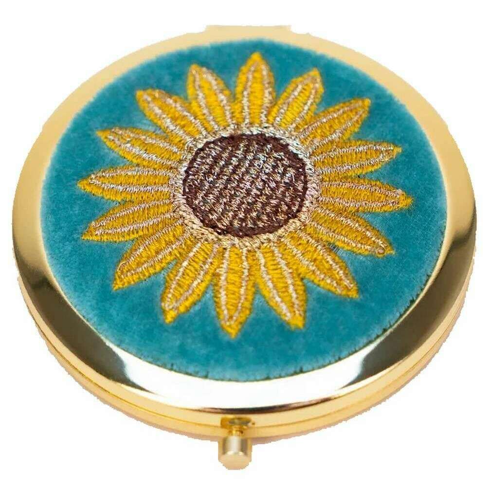 This summer sunflower embroidered mirror for women is fashioned by the brand Powder in a blue colour and is made from 100% polyester velvet and metal. It measures 7.5cm(height) x 7cm(width) x 1cm(depth). All the compacts come complete with powder packaging. The Powder Summer Sunflower Embroidered Mirror - Blue/Yellow/Brown is a must have for your handbag, acting as a lady s essential accessory that you will not be able to go without. Compact and beautifully embellished with intricate embroidered details, this mirror doesn t just reflect beauty on the inside but looks gorgeous on the outside too.