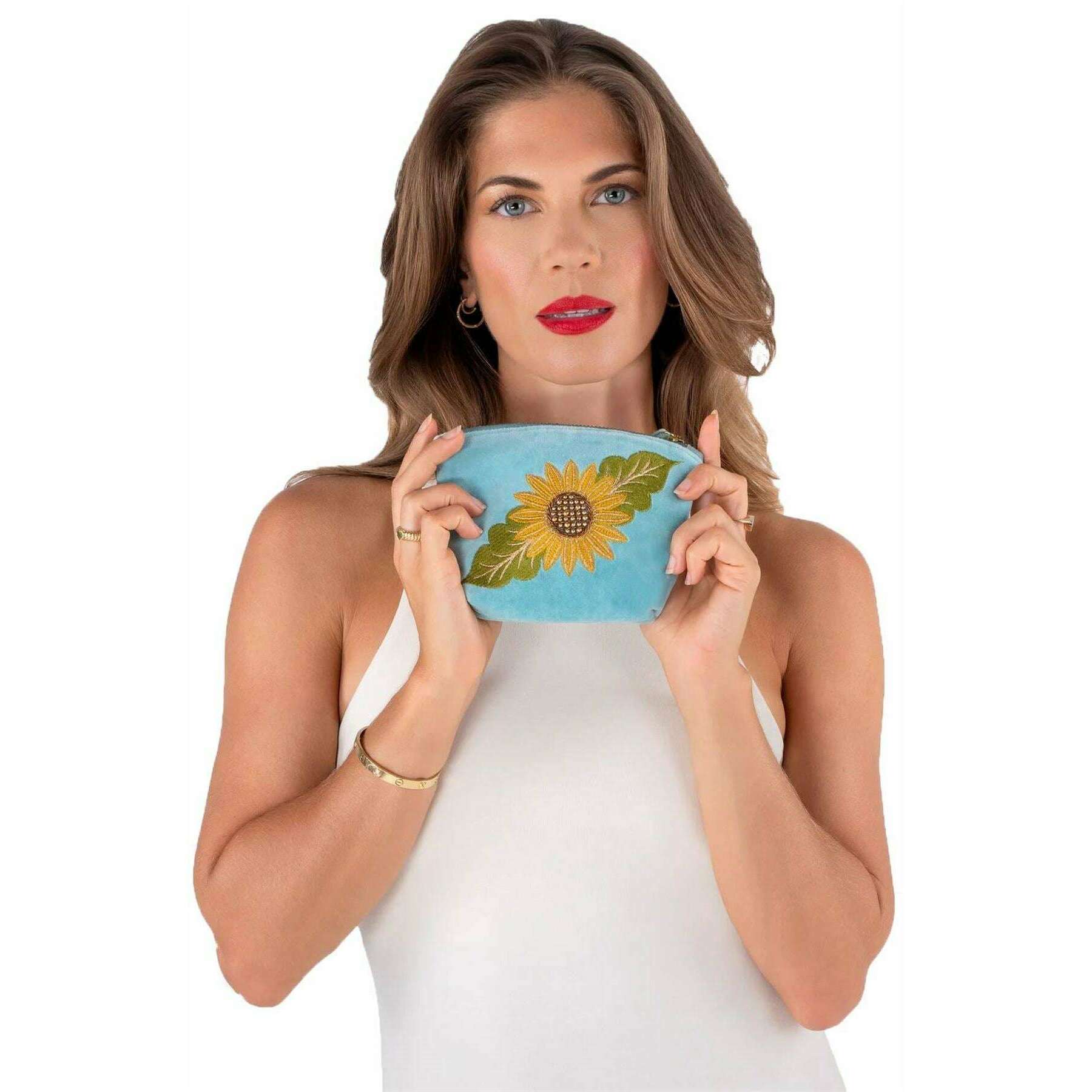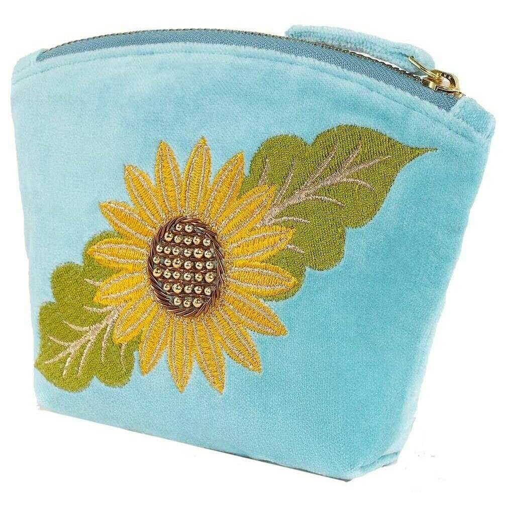 Powder Summer Sunflower Embroidered Velvet Mini Pouch - Blue/Yellow/Green
