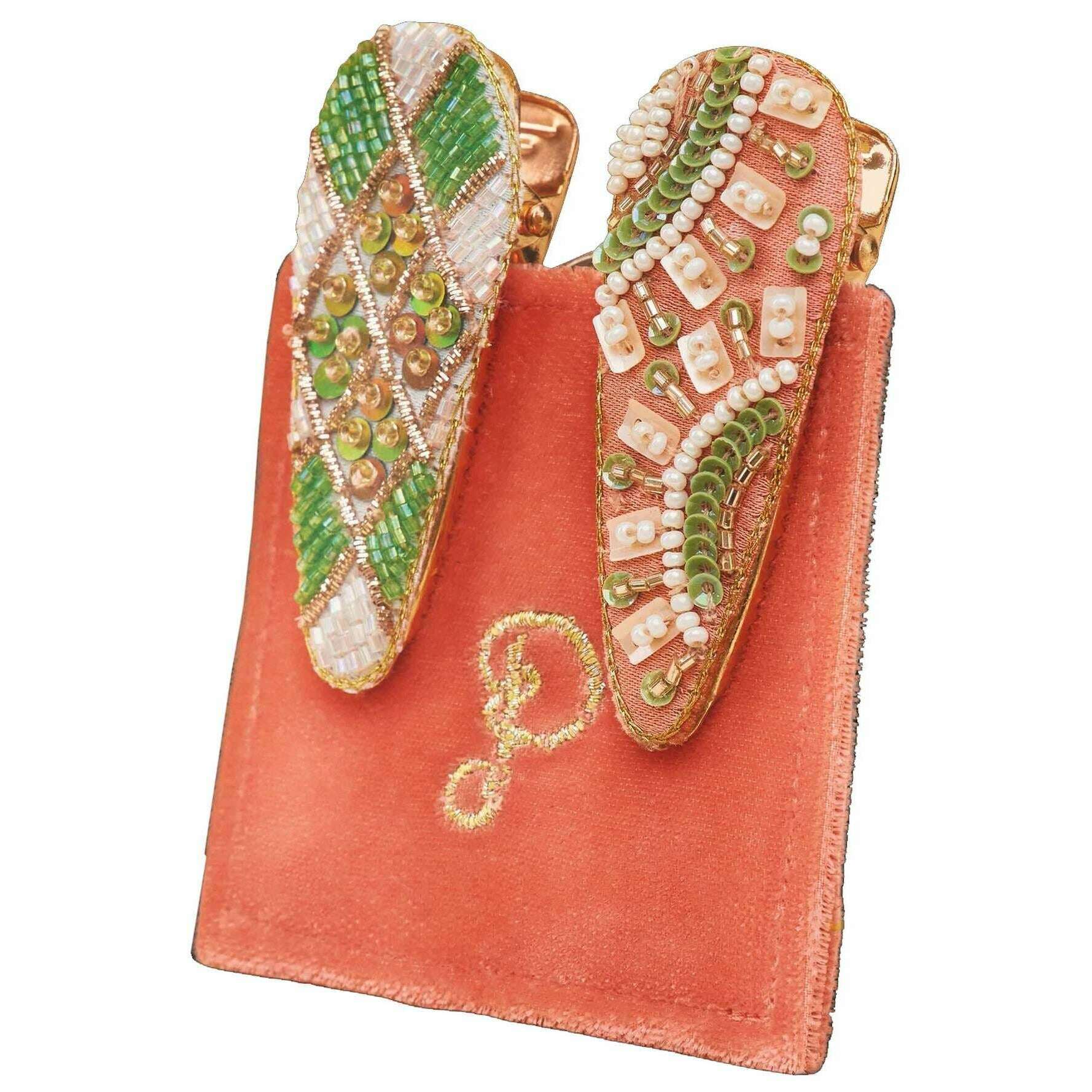 Manufactured from 100% polyester velvet is this pink/green/cream women's sunny hair clips by the designer Powder. It measures 8cm(height) x 7cm(width). 2 pack hair accessories is value for money ensuring they are a good buy, All the hair accessories comes complete with powder packaging. The Powder Sunny Hair Clips - Pink/Green/Cream will elevate your hair game on any occasion, adding stylish flair that will get people gawking. Beautifully embellished with an intricate bead design and embroidery this set of 2 hair clips are a must have for your collection.