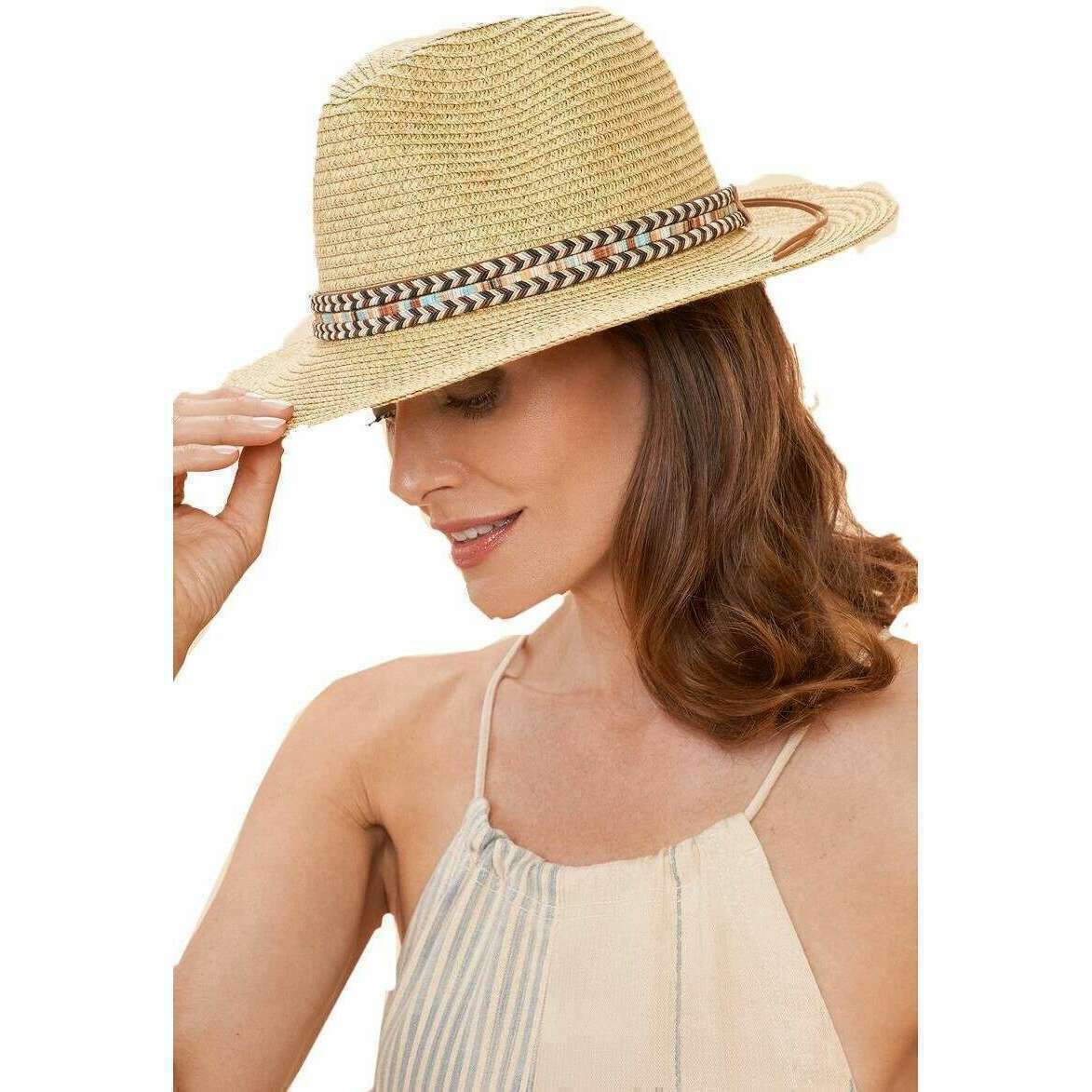 Manufactured from 100% paper is this vanilla beige women's thalia hat by the designer Powder. It measures 12cm(height) x 35cm(width) x 12cm(depth). All the hats come complete with powder tags. The Powder Thalia Hat - Vanilla Beige has you feeling classy. The Chevron band gives you a nice pop of colour to add to your outfits giving you that lovely style. Perfect for the summer.