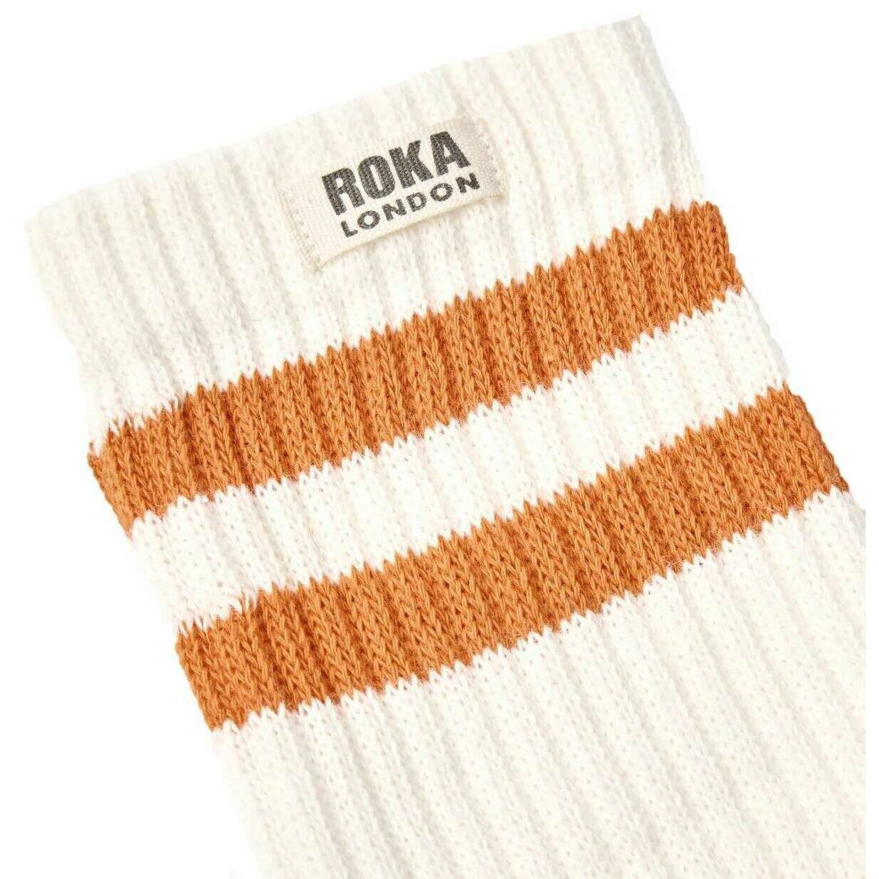 These men's windsor socks by the brand Roka are made from 82% organic cotton, 10% nylon and 2% elastane and are showcased in white. Also the burnt orange/white socks are designed in a striped pattern, All the socks come complete with roka packaging. The Roka Windsor Socks - Burnt Orange/White offer natural breathability and lasting softness for ultimate comfort. The classic crew length is elevated with signature double stripes, while a soft stretch cuff ensures they stay put throughout the day. Designed to keep their shape, colour, and softness wash after wash, these socks are ideal for commuting, gym mornings, and everything in between.