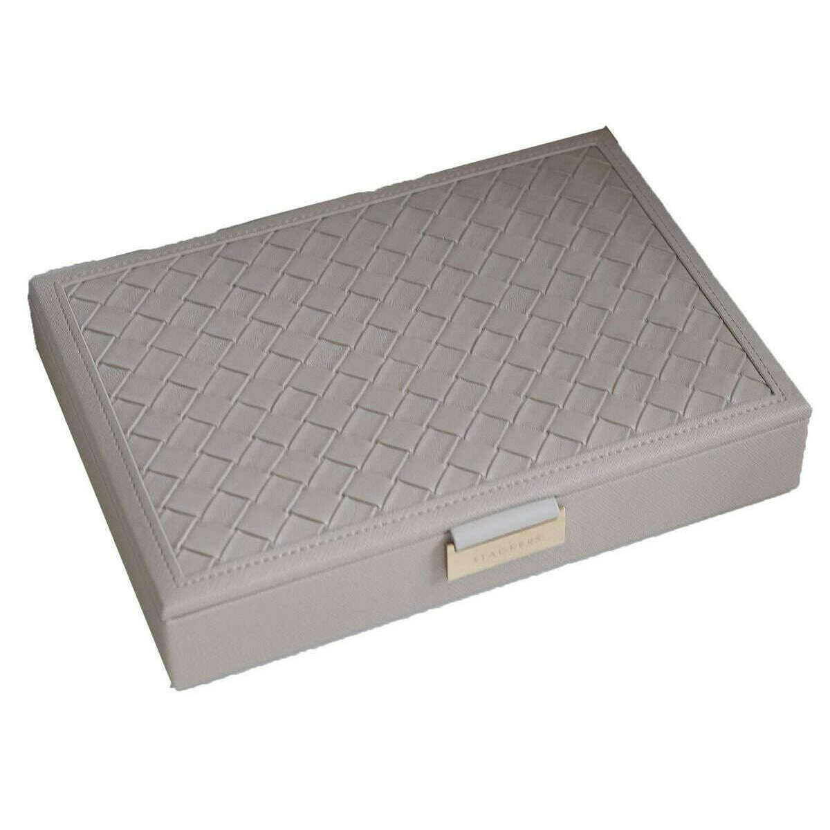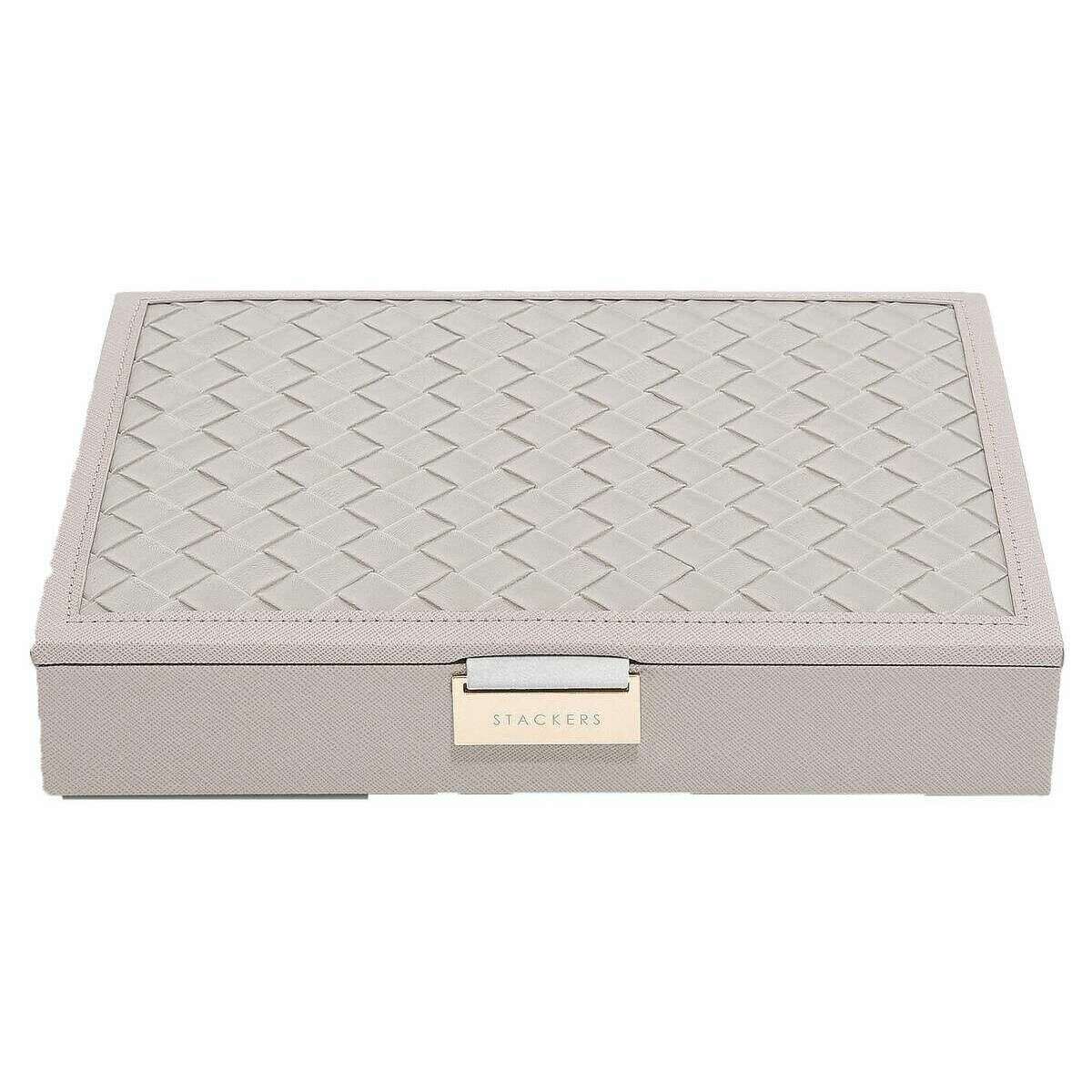 This classic jewellery box lid for women is fashioned by the brand Stackers in a grey colour and is made from faux leather and velvet. It measures 4.7cm(height) x 25cm(width) x 18cm(depth). All the jewellery boxes come complete with stackers packaging. The Stackers Classic Jewellery Box Lid - Taupe features a beautiful woven taupe design. This jewellery box lid is perfect for storing all your jewellery items! Comes complete with multiple sized sections for rings, earrings, bracelets and necklaces.