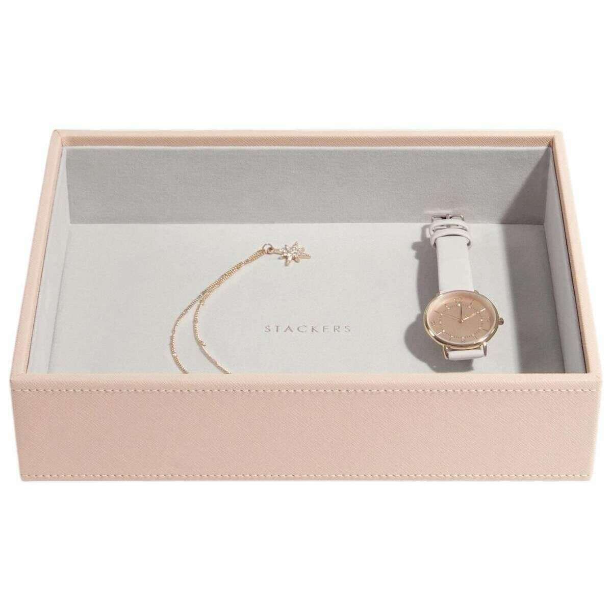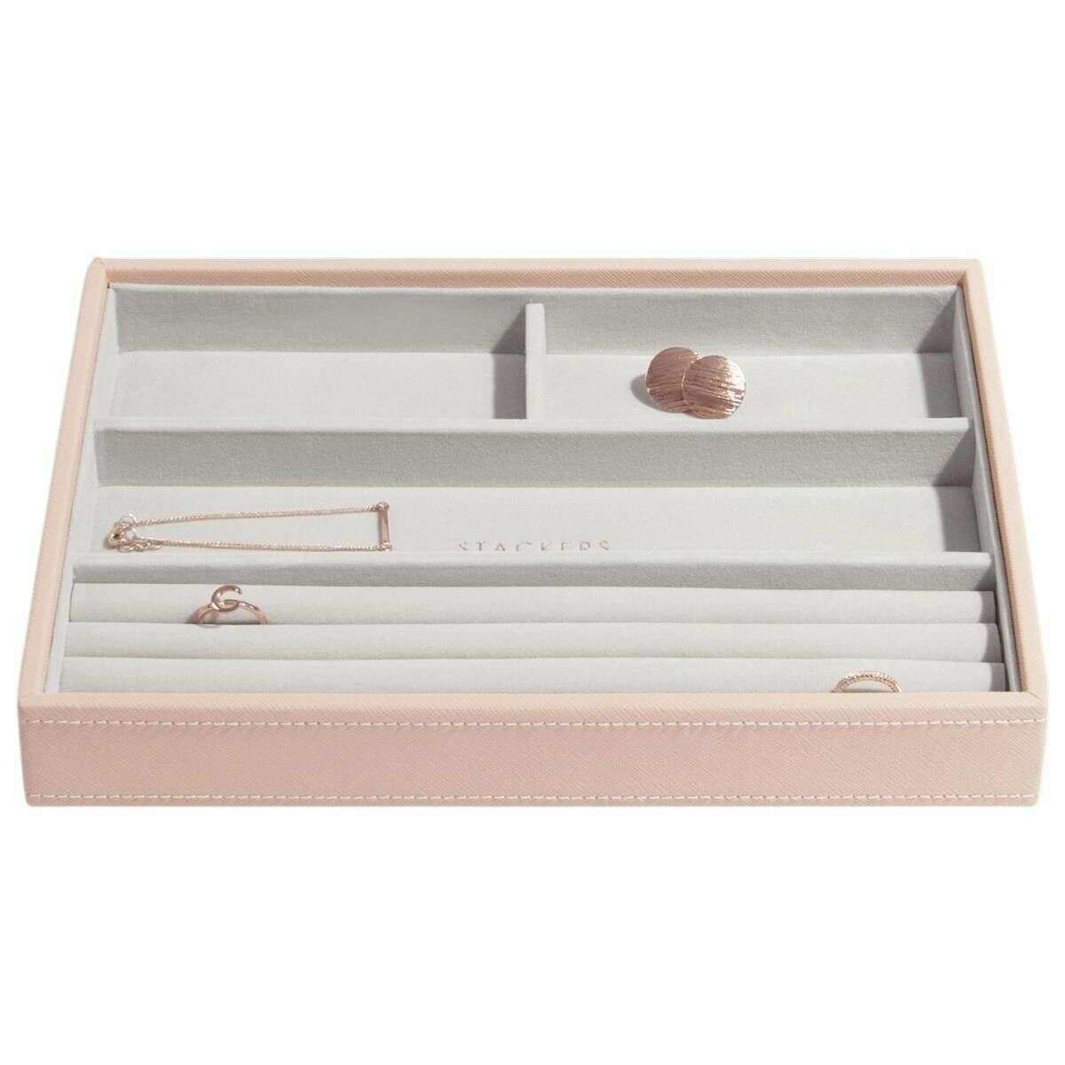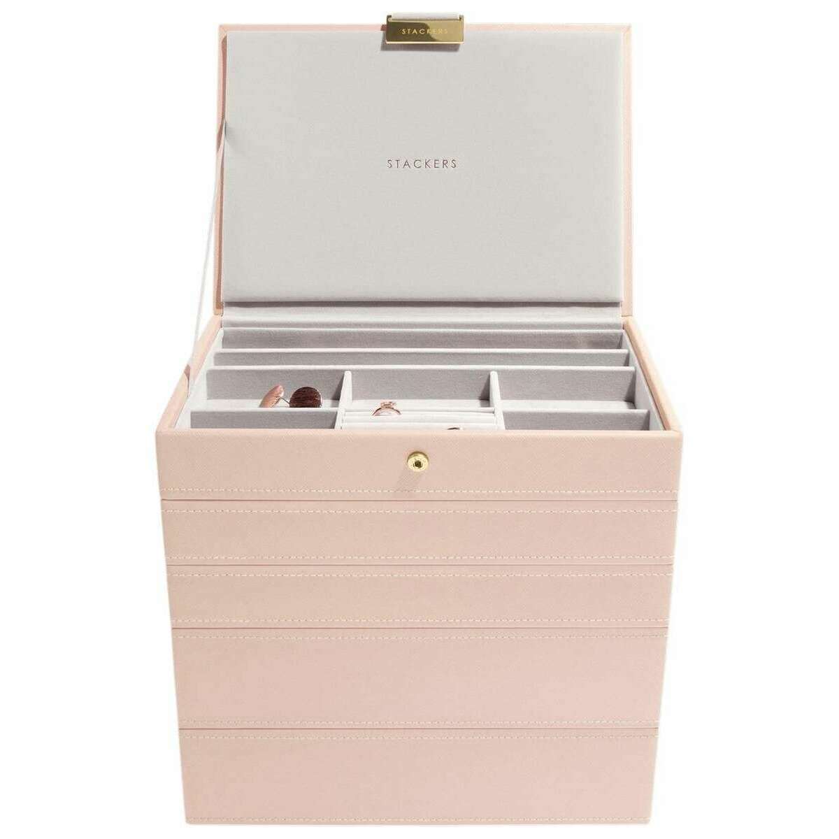 Designer Stackers has brought you this women's faux leather and velvet jewellery box using blush pink/gold tones. It measures 25.5cm(height) x 25cm(width) x 18cm(depth). It is recommended to wipe clean to keep this jewellery box in good condition. All the jewellery boxes come complete with stackers packaging. The Stackers Classic Jewellery Box set of 5 - Blush Pink/Gold is certain to impress with its unbelievable amount of space. Featuring a top lidded section for those precious little pieces, a middle 25 section tray for those charms or rings, another middle tray with three sections to hold your bracelets and necklaces with ring rolls to store more rings and earrings, and then a deep three section box for those larger items like big bracelets, watches and sunglasses, and finally a deep layer that is open for any other larger pieces. Make this the most ideal jewellery box you can own with it offering so much in the most luxurious way.