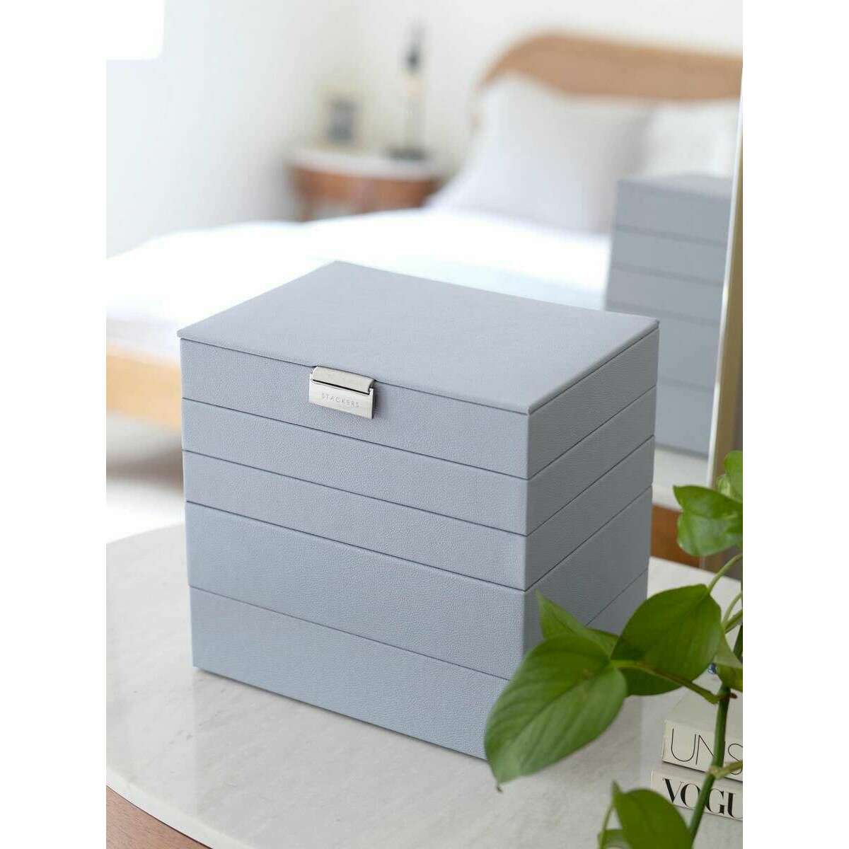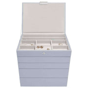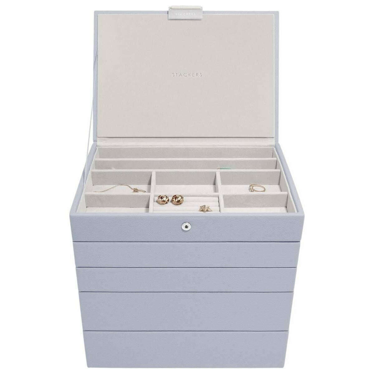 This women's classic jewellery box set of 5 has been made from faux leather and velvet, featured in a purple colour and is from the brand Stackers. It measures 25.5cm(height) x 25cm(width) x 18cm(depth). It is recommended to wipe clean to keep this jewellery box in good condition. All the jewellery boxes come complete with stackers packaging. The Stackers Classic Jewellery Box set of 5 - Lavender Purple is certain to impress with its unbelievable amount of space. Featuring a top lidded section for those precious little pieces, a middle 25 section tray for those charms or rings, another middle tray with three sections to hold your bracelets and necklaces with ring rolls to store more rings and earrings, and then a deep three section box for those larger items like big bracelets, watches and sunglasses, and finally a deep layer that is open for any other larger pieces. Make this the most ideal jewellery box you can own with it offering so much in the most luxurious way.