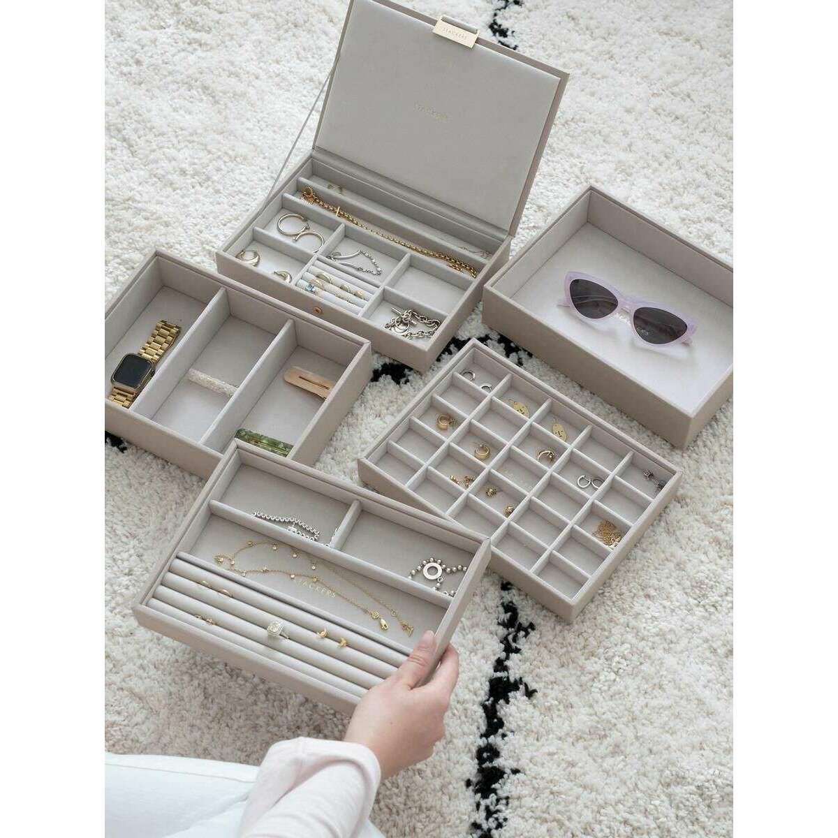 Using beige faux leather and velvet, this classic jewellery box set of 5 by Stackers is perfect for women and a must have. It measures 25.5cm(height) x 25cm(width) x 18cm(depth). It is recommended to wipe clean to keep this jewellery box in good condition. All the jewellery boxes come complete with stackers packaging. The Stackers Classic Jewellery Box set of 5 - Taupe Beige is certain to impress with its unbelievable amount of space. Featuring a top lidded section for those precious little pieces, a middle 25 section tray for those charms or rings, another middle tray with three sections to hold your bracelets and necklaces with ring rolls to store more rings and earrings, and then a deep three section box for those larger items like big bracelets, watches and sunglasses, and finally a deep layer that is open for any other larger pieces. Make this the most ideal jewellery box you can own with it offering so much in the most luxurious way.