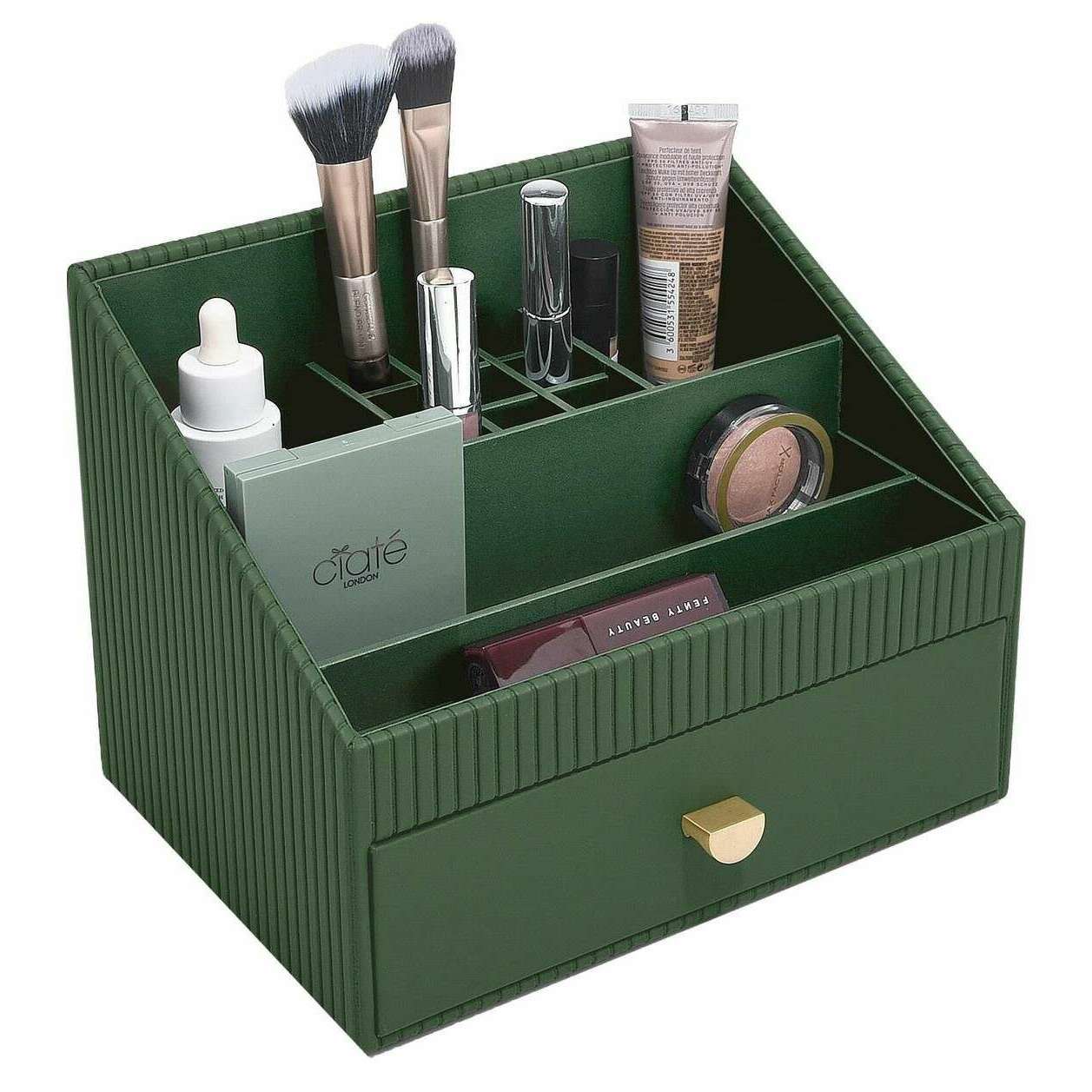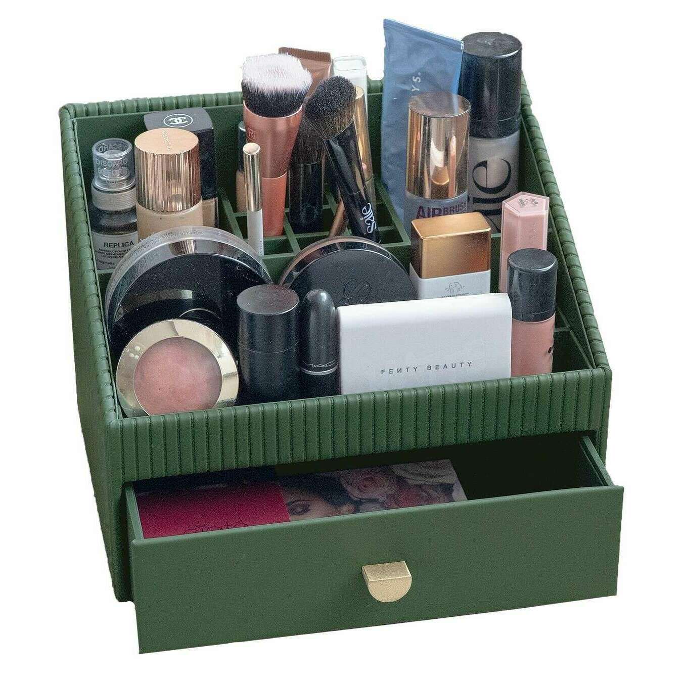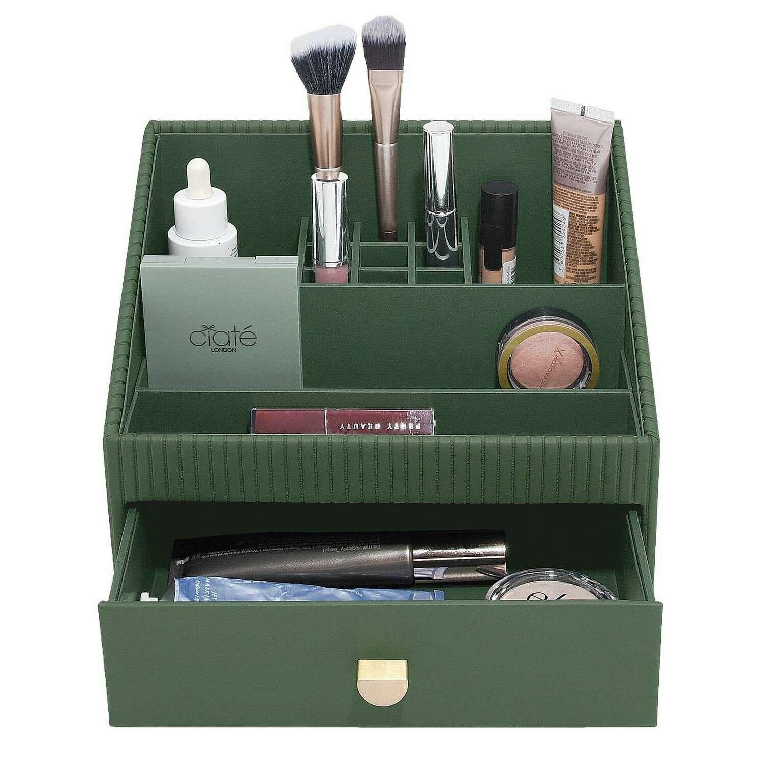 This women's classic makeup organiser by the brand Stackers is made from faux leather and pvc and is showcased in green. It measures 19cm(height) x 25cm(width) x 18cm(depth). All the makeup organisers come complete with stackers packaging. The Stackers Classic Makeup Organiser - Emerald Green features multiple compartments for your makeup or skin care products. This beautiful ribbed green makeup organiser has a draw for larger products, perfect for keeping organised and saving space!