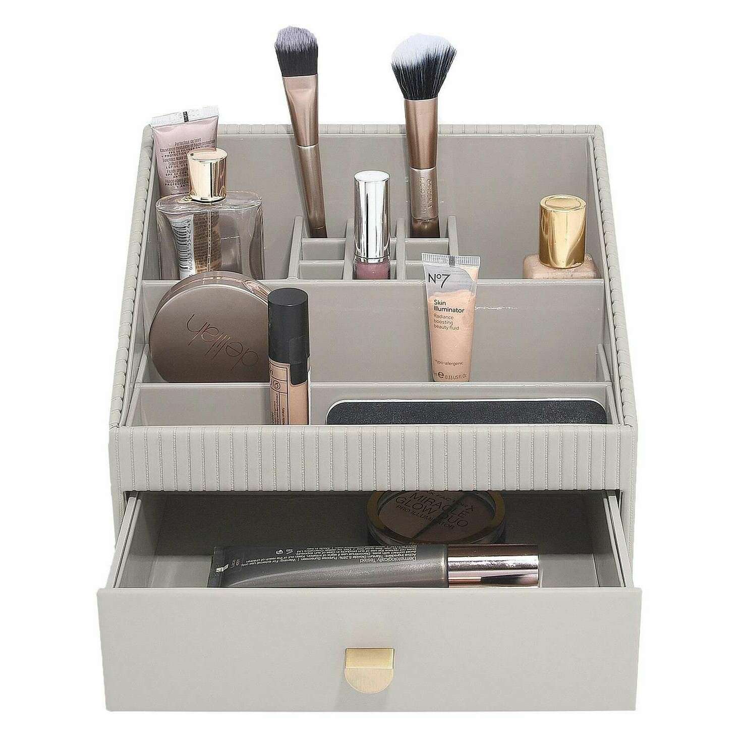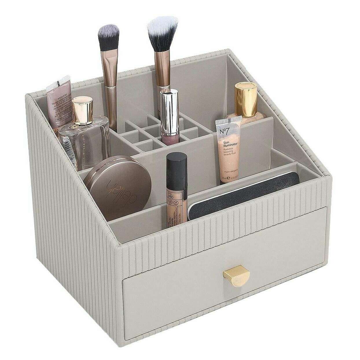 Brought to you by the brand Stackers, this limestone grey women's classic makeup organiser is made from faux leather and pvc. It measures 19cm(height) x 25cm(width) x 18cm(depth). All the makeup organisers come complete with stackers packaging. The Stackers Classic Makeup Organiser - Limestone Grey features multiple compartments for your makeup or skin care products. This beautiful ribbed grey makeup organiser has a draw for larger products, perfect for keeping organised and saving space!